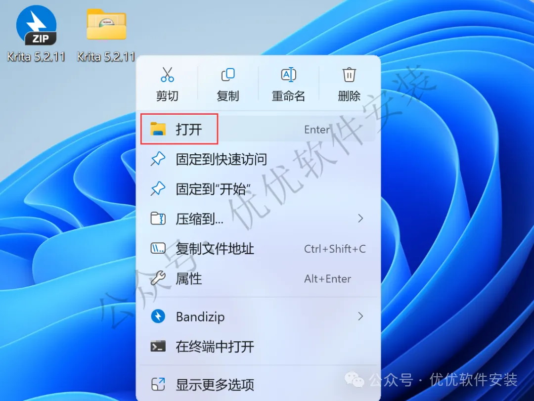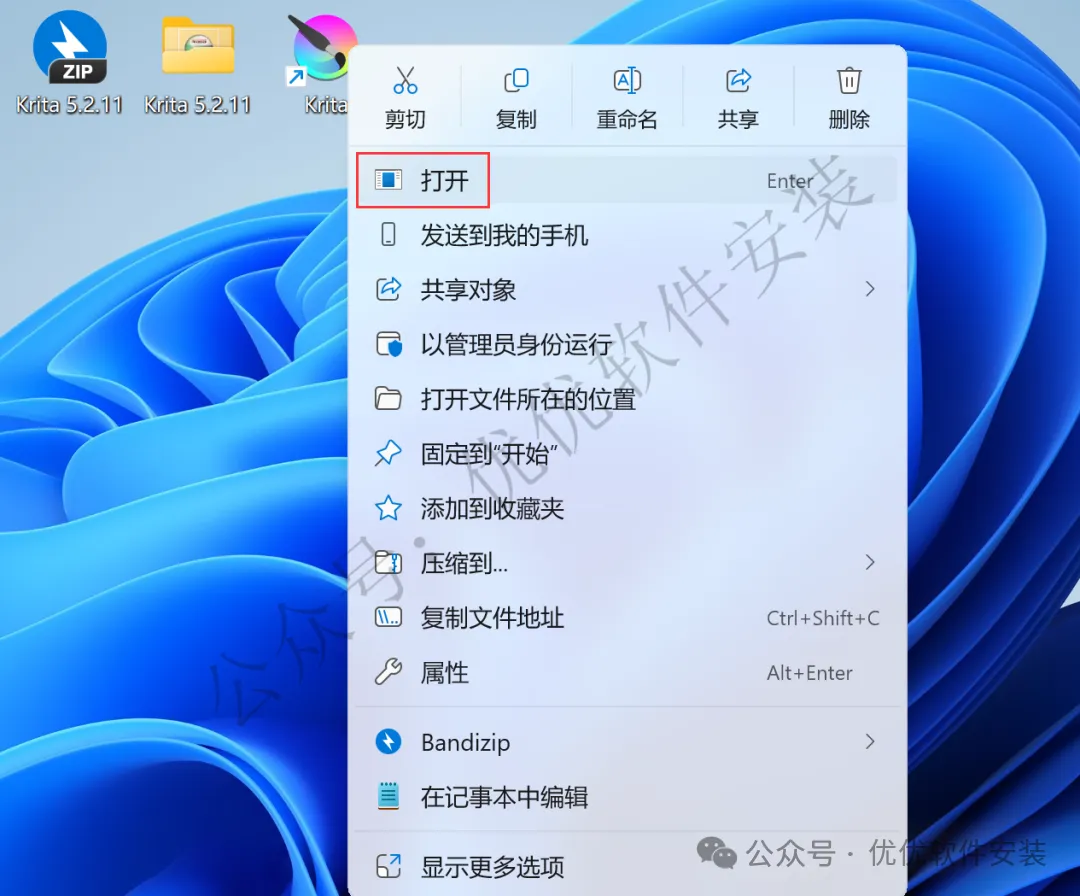 15、回到桌面,右键桌面上的【Krita软件图标】,点击【打开】