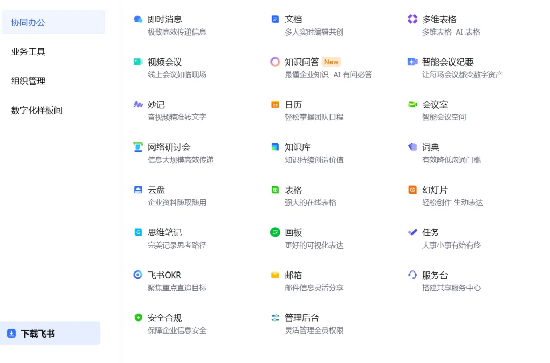 飞书作为国产协作平台的代表,由字节开发,集成了即时通讯、日历、文档、视频会议等功能。这款工具都能让个人和团队的协作效率大幅提升,而且现在融入了很多AI功能更能提高工作效率。