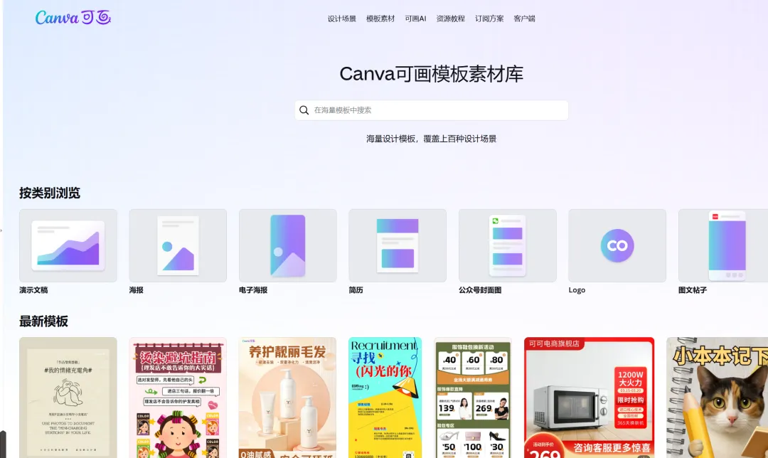 Canva提供了海量的设计模板和素材,即使没有设计基础的用户也能快速制作出精美的海报、社交媒体图片、演示文稿等。网页版功能完整,支持团队协作,大大降低了设计门槛。