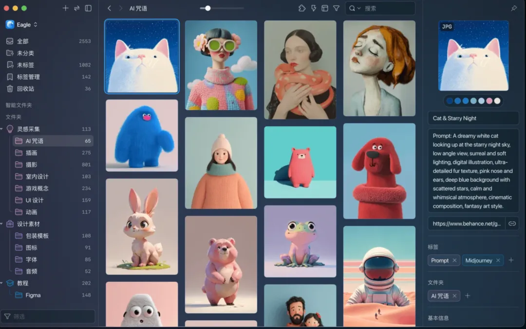 介绍: Eagle是专业的图片素材管理工具,支持智能文件夹、标签系统、颜色搜索等功能。可以帮助设计师和创作者高效管理数以万计的图片素材,快速找到需要的灵感。