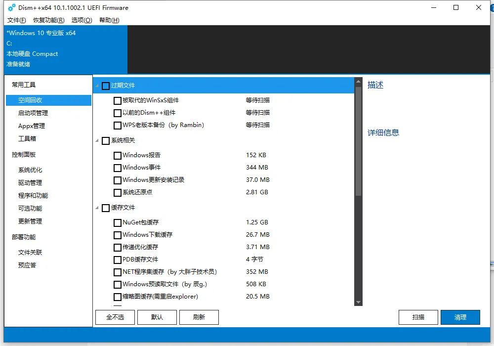 介绍: Dism++基于微软官方DISM核心开发,但提供了更友好的图形界面。功能包括系统清理、驱动管理、更新管理、系统备份还原等,是Windows系统维护的瑞士军刀,清理C盘的利器。