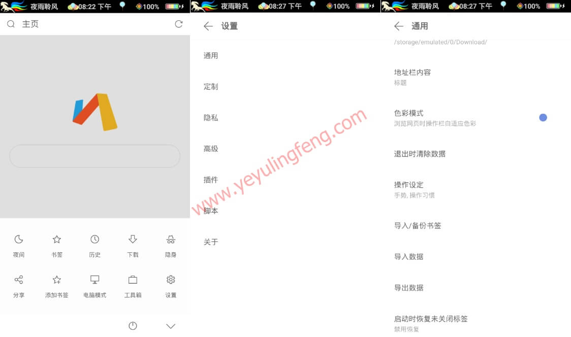 几百KB的安装包体积一些主流的浏览器打死也不可能做到的吧,毕竟广告版块都不止了,当然老夜见过体积最小的浏览器还有X浏览器貌似跟Via不分上下了,难以想象1M不到的工具能够带来不亚于10M甚至20M的功能体验,总的来说,化繁为简,对于极简的追求,Via始终如一。