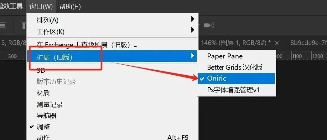 3、然后打开PS在软件顶部window窗口-扩展里即可看到Oniric插件