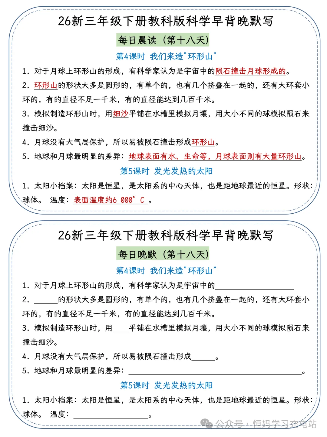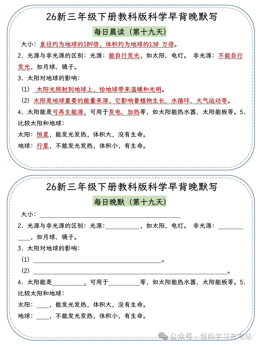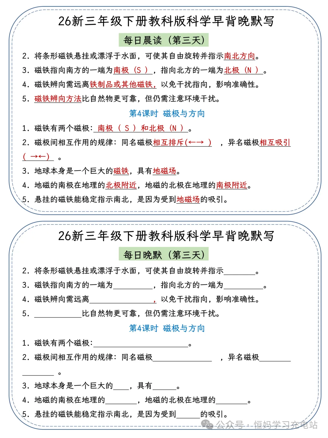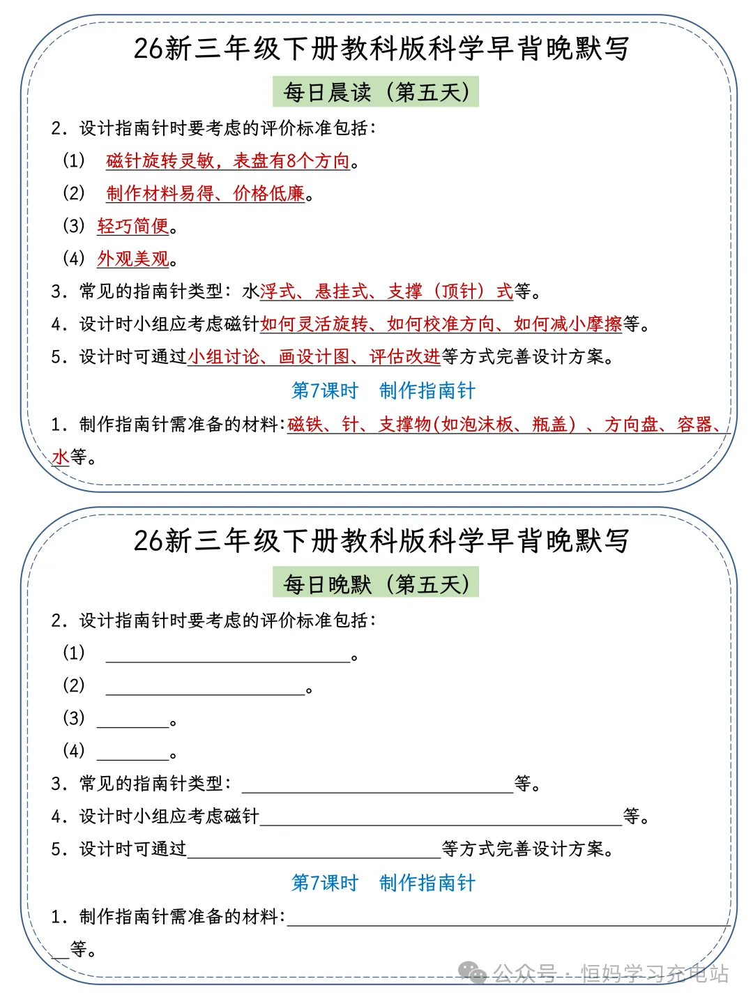 26年春3年级科学下册《早读晚默小纸条》教科版,共22页。提升记忆效率早读利用大脑清醒时段,帮助学生快速记住科学概念、实验步骤和观察结果,强化知识点的理解和记忆。培养学习习惯每天固定时间的早读和晚默,有助于学生养成规律的学习习惯,增强学习的主动性和坚持性。巩固知识晚默通过默写和填空,帮助学生巩固当天所学的科学知识,及时发现和弥补知识漏洞,提升学习效果。