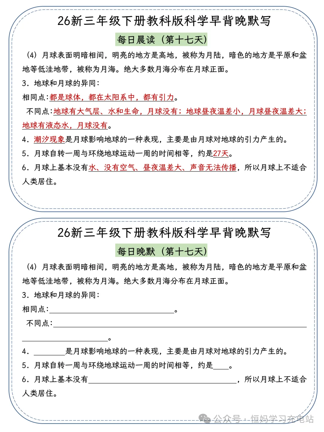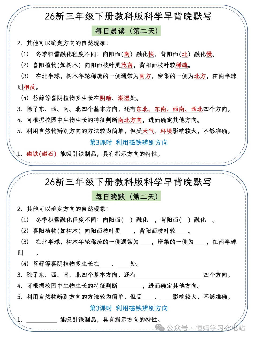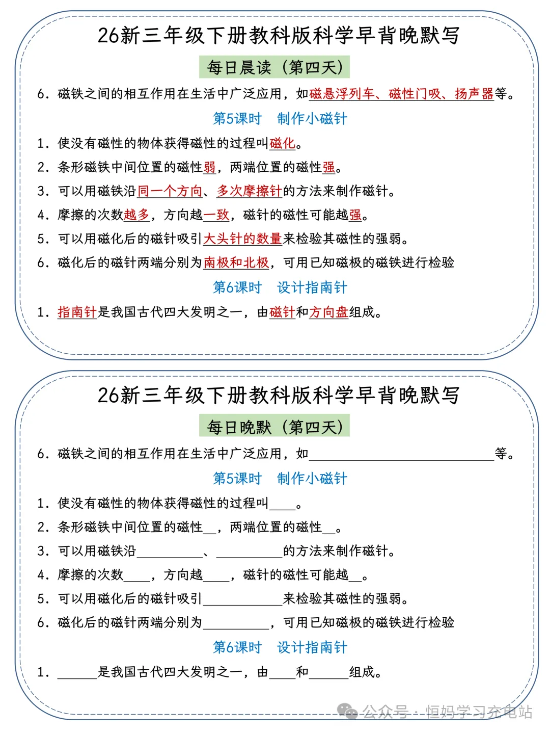 26年春3年级科学下册《早读晚默小纸条》教科版,共22页。提升记忆效率早读利用大脑清醒时段,帮助学生快速记住科学概念、实验步骤和观察结果,强化知识点的理解和记忆。培养学习习惯每天固定时间的早读和晚默,有助于学生养成规律的学习习惯,增强学习的主动性和坚持性。巩固知识晚默通过默写和填空,帮助学生巩固当天所学的科学知识,及时发现和弥补知识漏洞,提升学习效果。
