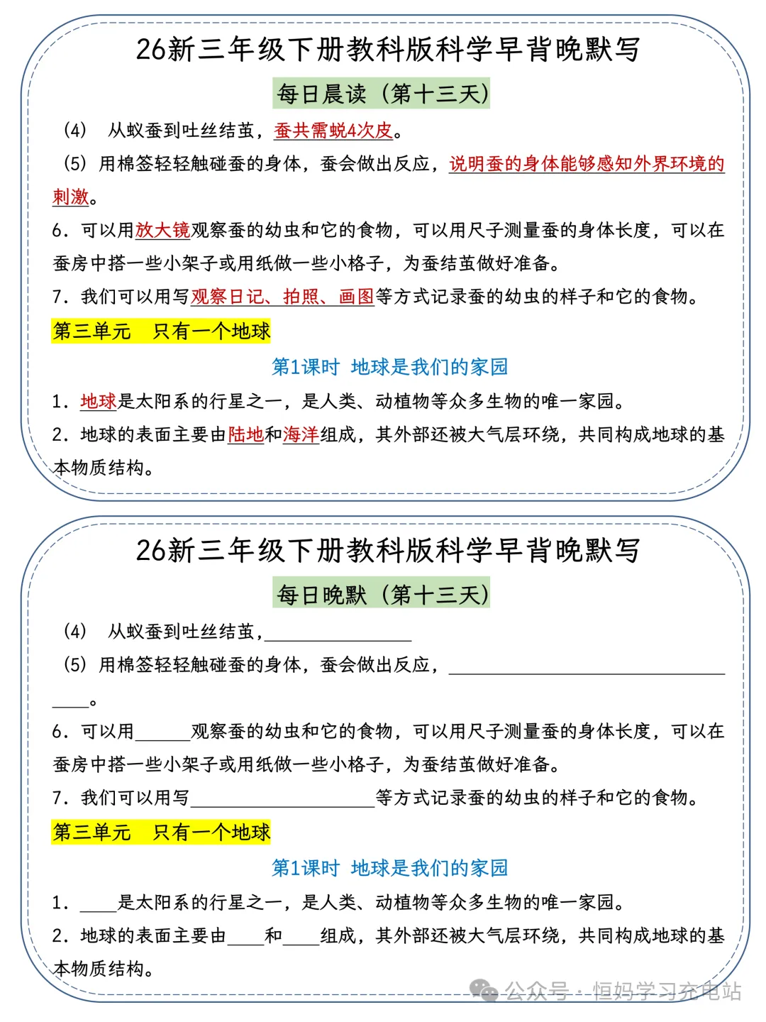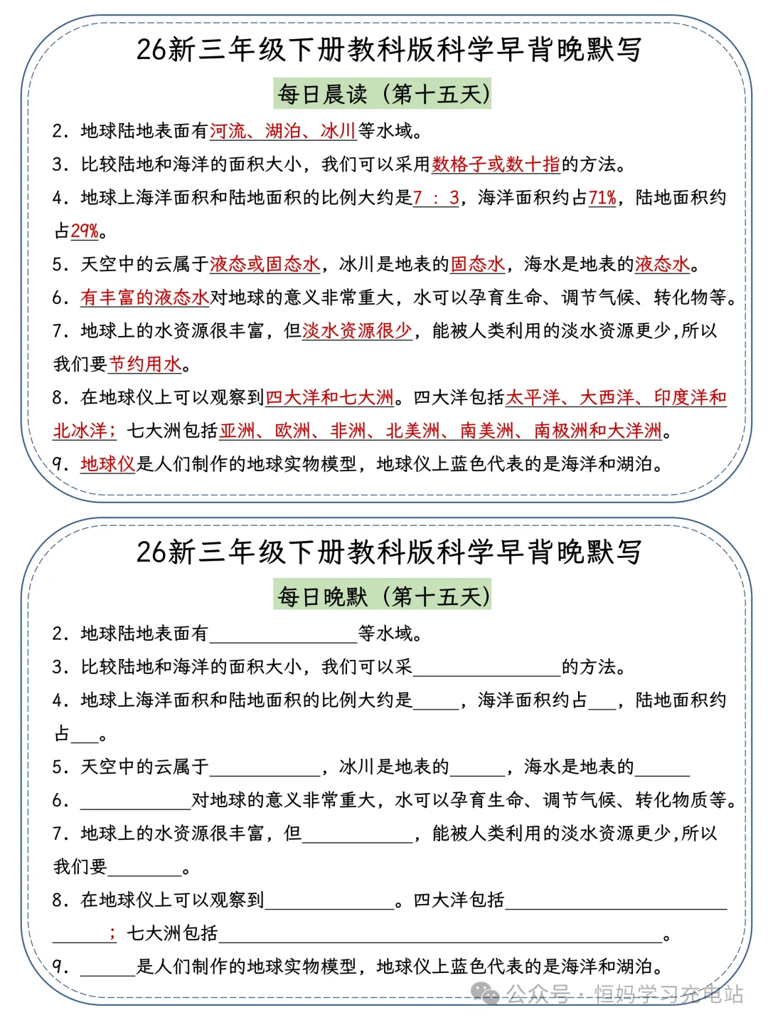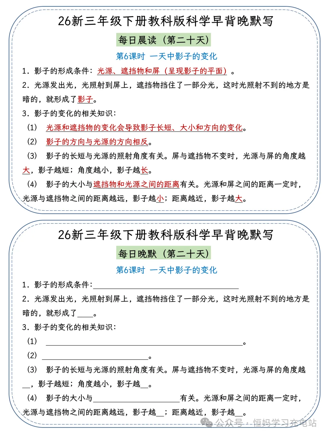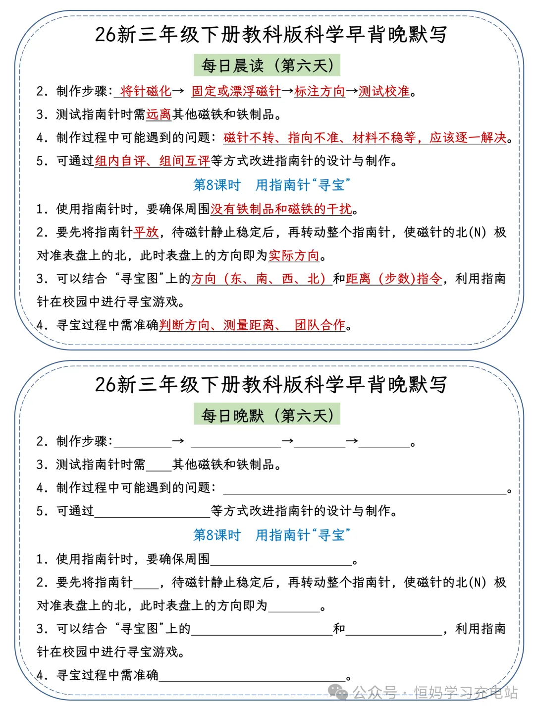 26年春3年级科学下册《早读晚默小纸条》教科版,共22页。提升记忆效率早读利用大脑清醒时段,帮助学生快速记住科学概念、实验步骤和观察结果,强化知识点的理解和记忆。培养学习习惯每天固定时间的早读和晚默,有助于学生养成规律的学习习惯,增强学习的主动性和坚持性。巩固知识晚默通过默写和填空,帮助学生巩固当天所学的科学知识,及时发现和弥补知识漏洞,提升学习效果。