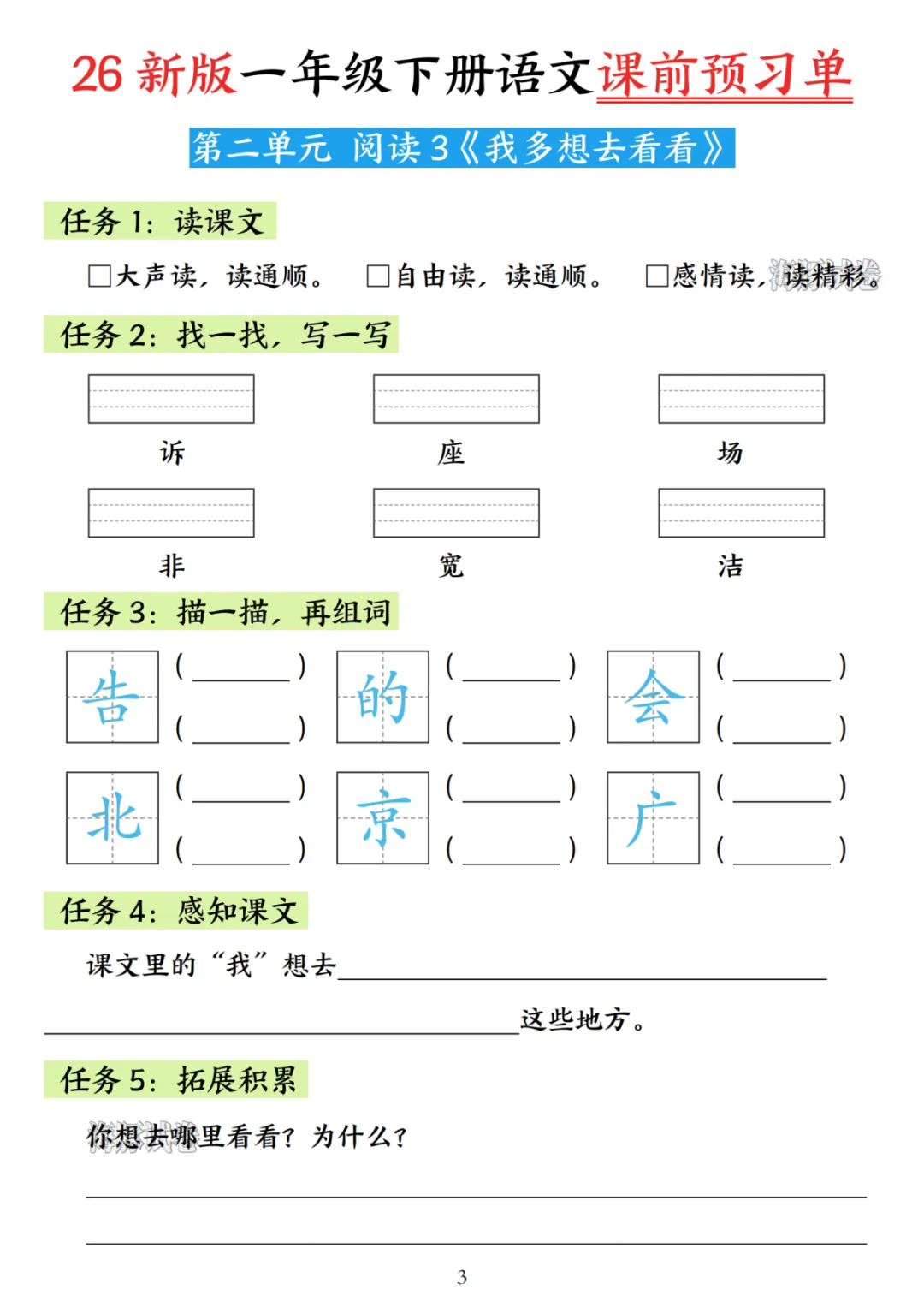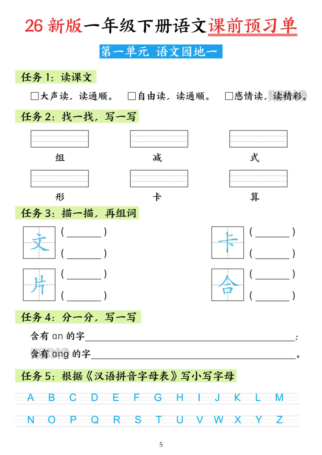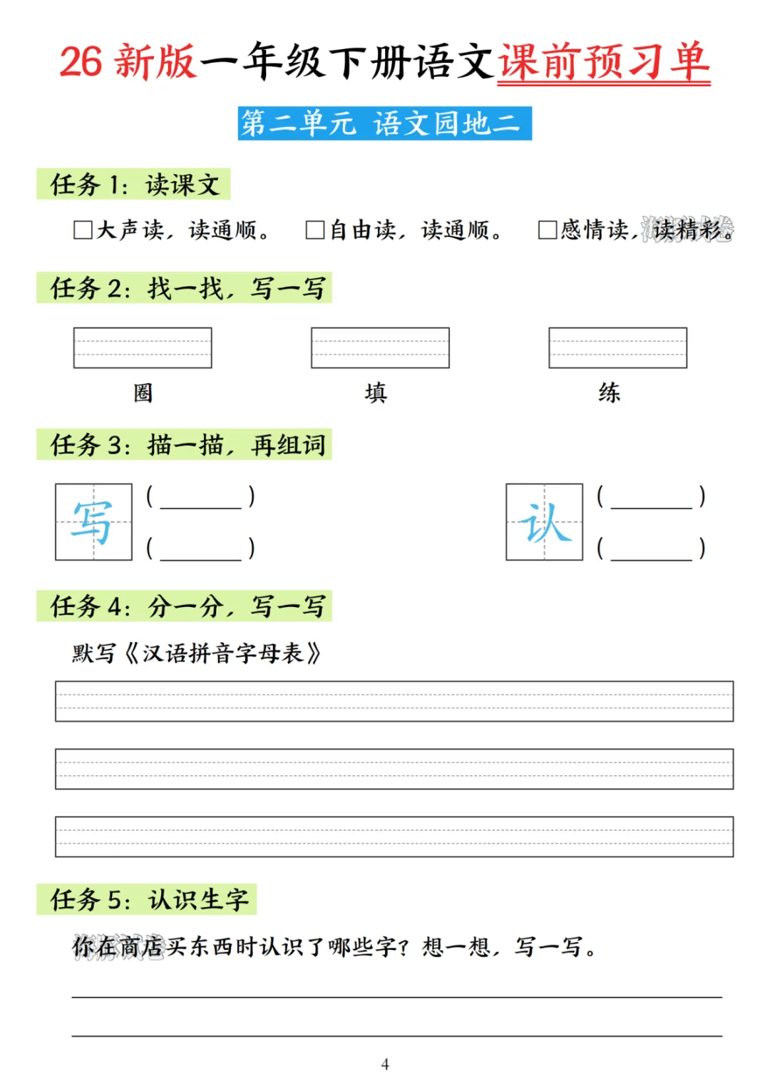 26年一年级语文下册《课前预习单》可下载打印