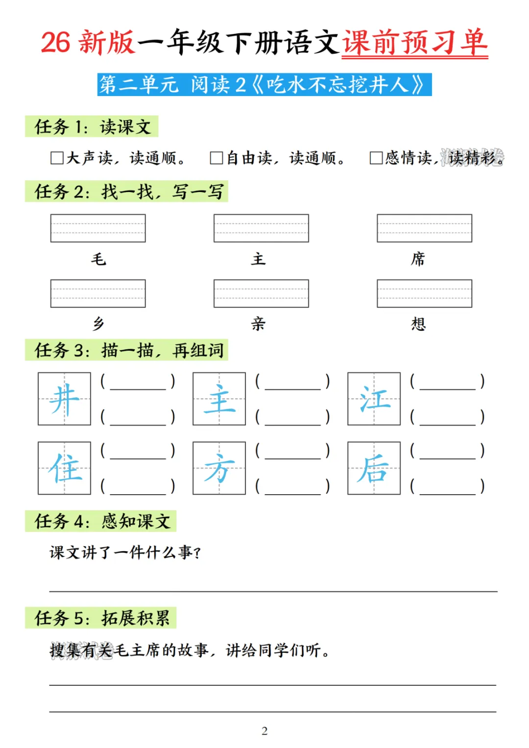 本期分享的是26年一年级语文下册《课前预习单》可下载打印,需要的家长赶紧打印给孩子练一练,巩固知识。