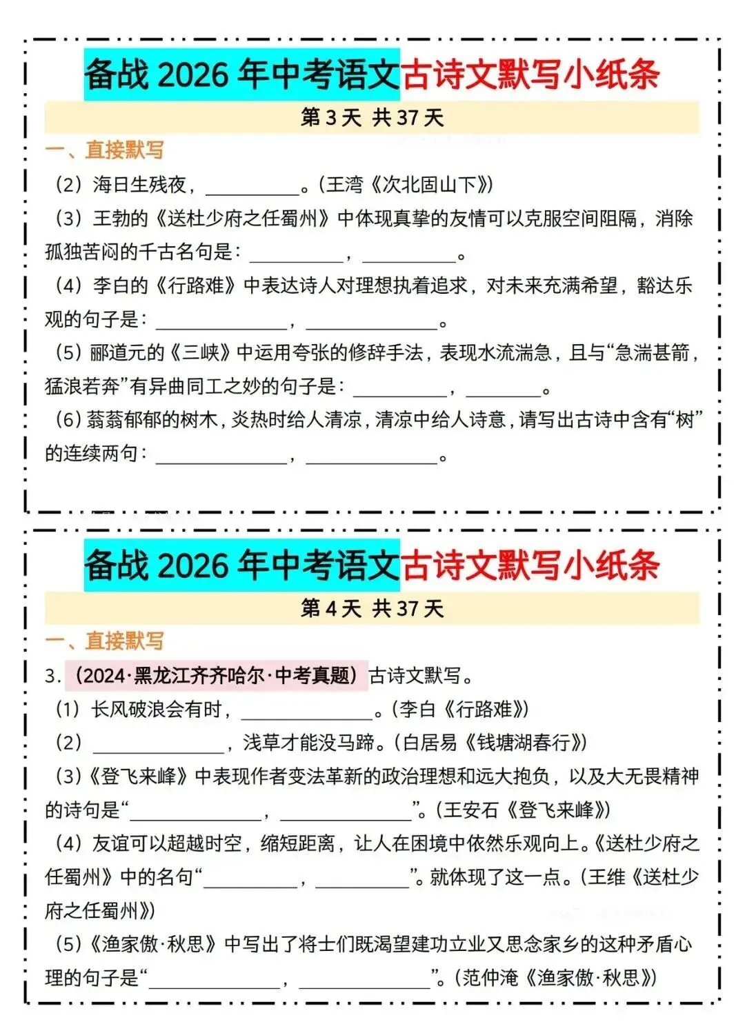 今天要分享的内容是2026中考古诗文每日一练,全面覆盖初中阶段必背古诗文篇目,把默写、字词、翻译、赏析、阅读等核心考点拆解到每日练习中,让备考更有方向。