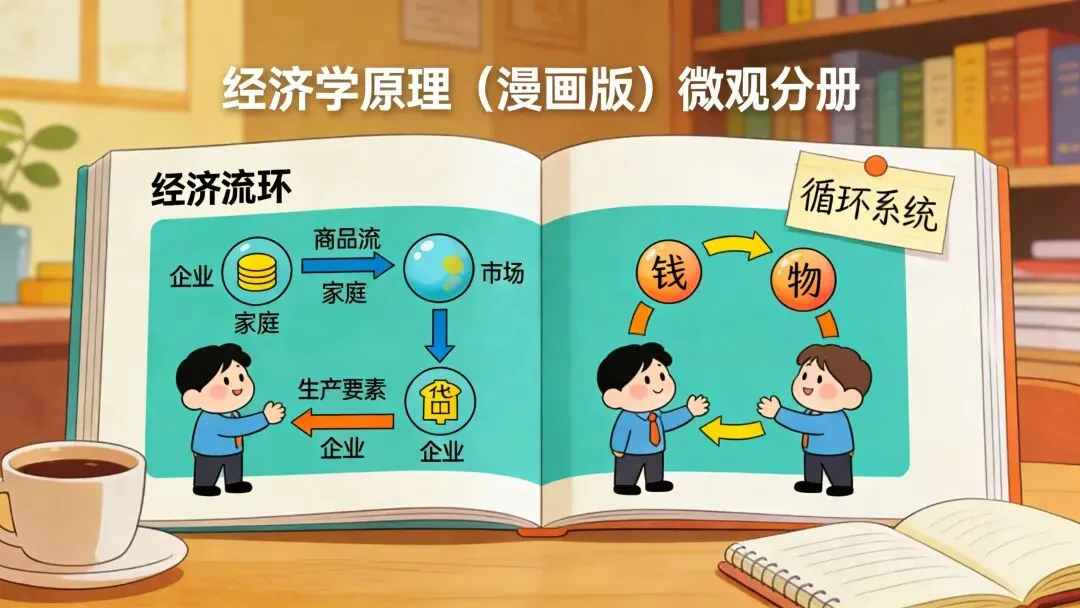 翻到第二章“像经济学家一样思考”,一幅图让我停了下来。那是一张叫“经济流环”的示意图:企业、家庭、市场之间用箭头连接,商品流向家庭,生产要素流向企业,货币反向流动。画里有两个小人,一个站在家庭端,一个站在企业端,互相抛接着代表“钱”和“物”的圆球。