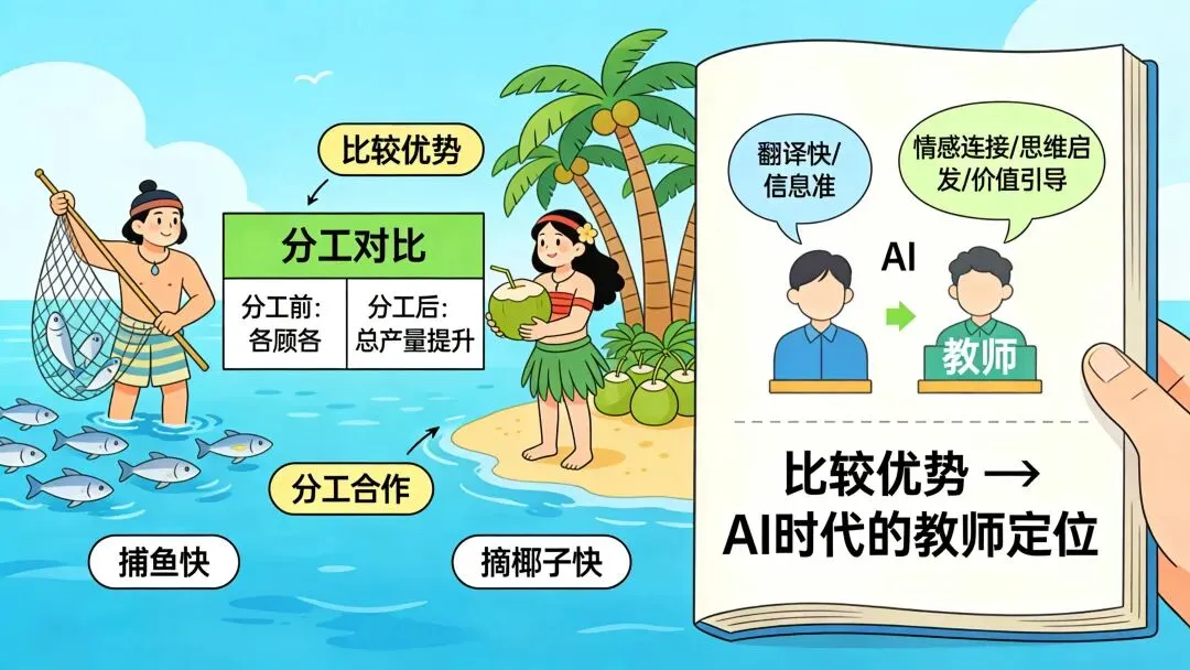 想了几天,想出一个答案:比较优势。其实在回答一个困扰我们很久的问题——当AI能做翻译、能做基础教学,外语教师的价值到底在哪里?套用比较优势的逻辑:即使AI在“翻译”和“信息提供”这两个方面都比人类教师做得快、做得好,但只要人类教师在“情感连接”“思维启发”“价值引导”这些方面有相对优势,分工就是有价值的。我们不需要在所有维度上打败AI,只需要在自己的优势领域深耕。这个思考让我在漫画的空白页上写了一行字:比较优势 → AI时代的教师定位。