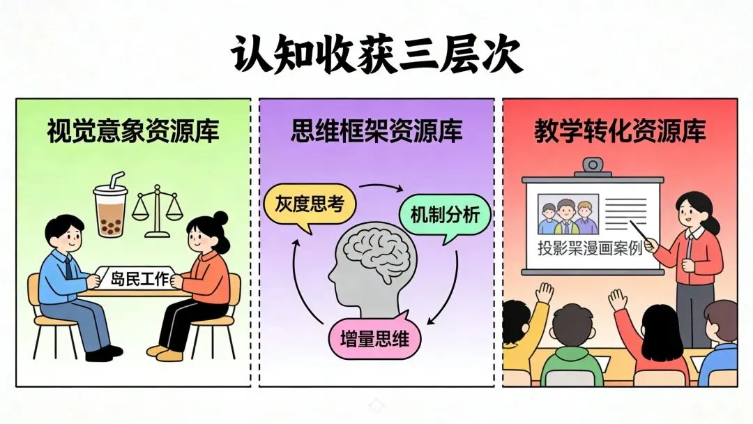 那些漫画画面成了概念的“认知锚点”:机会成本是天平两端的取舍,比较优势是两个岛民的分工,供需曲线是拍卖会的举牌,边际效用是喝第一口奶茶的满足感。以后遇到这些概念,我不需要回忆定义,画面直接跳出来,意思就懂了。这种“画面绑定概念”的方式,比死记硬背定义高效得多。