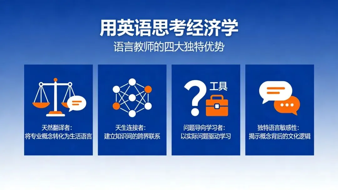 经济学老师讲“机会成本”,会直接抛出定义、公式、案例,他们默认学生能听懂专业语言。但我们太清楚专业语言对普通人的门槛有多高,所以我们理解“机会成本”的方式,天然带着“翻译”的意识——会关注那个天平意象,会思考如何用生活里的选择来解释这个概念。这种翻译能力,是我们作为语言教师的看家本领。现在只是把这种能力迁移到学科概念的理解上。