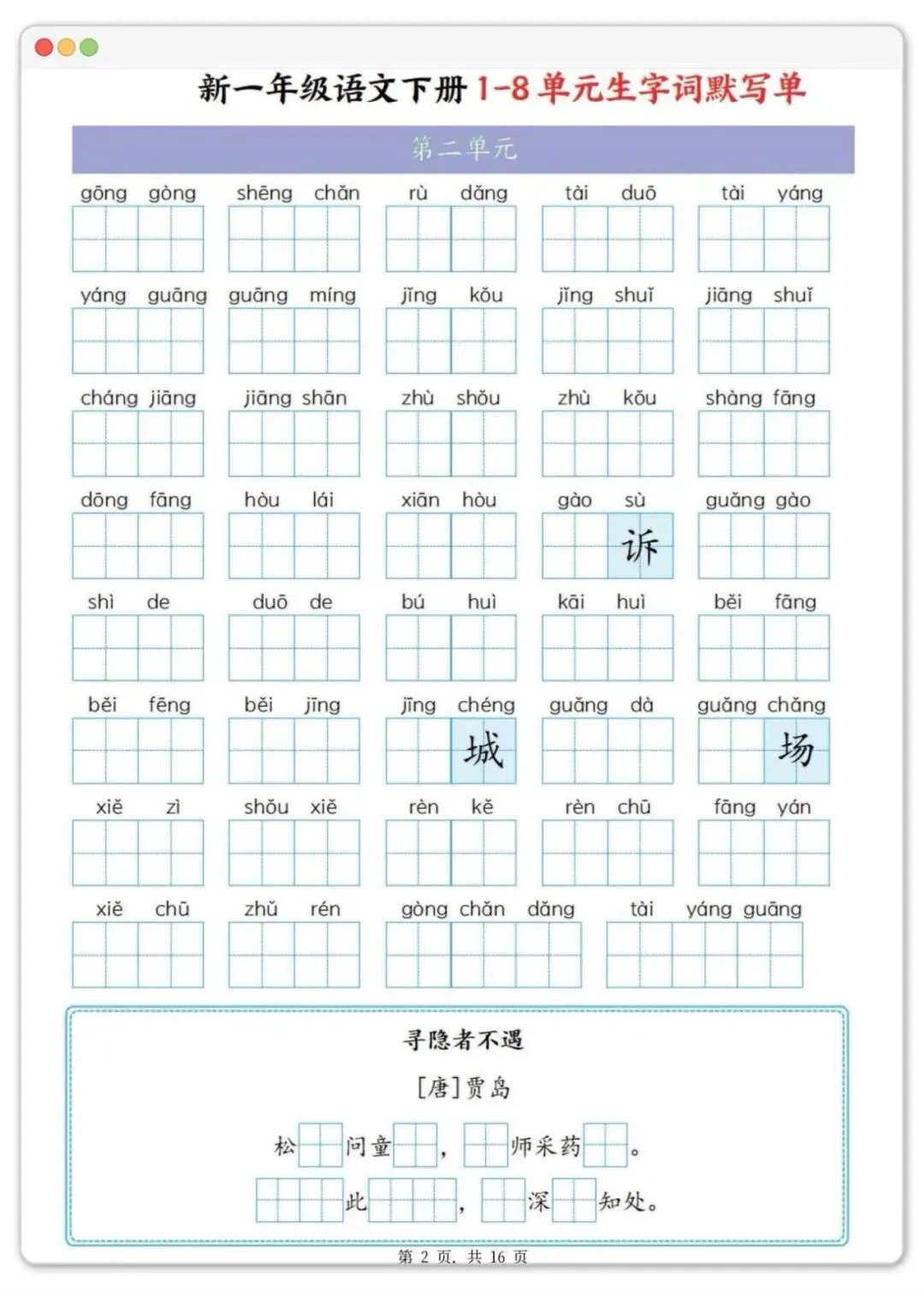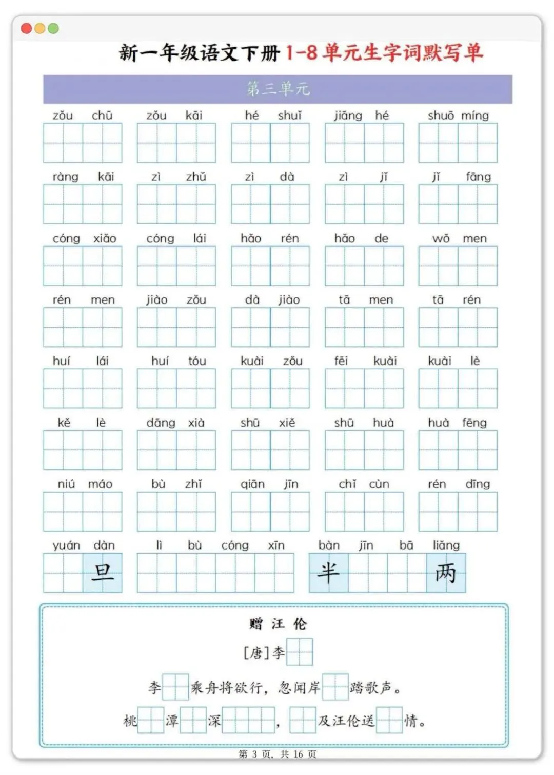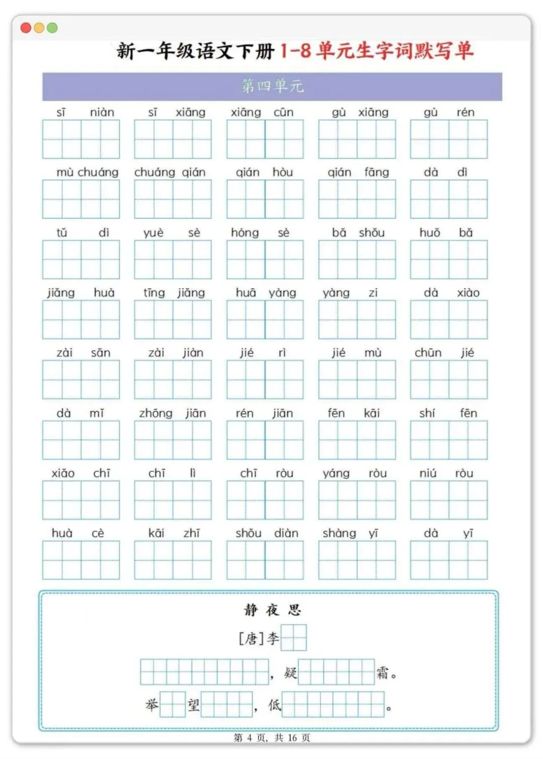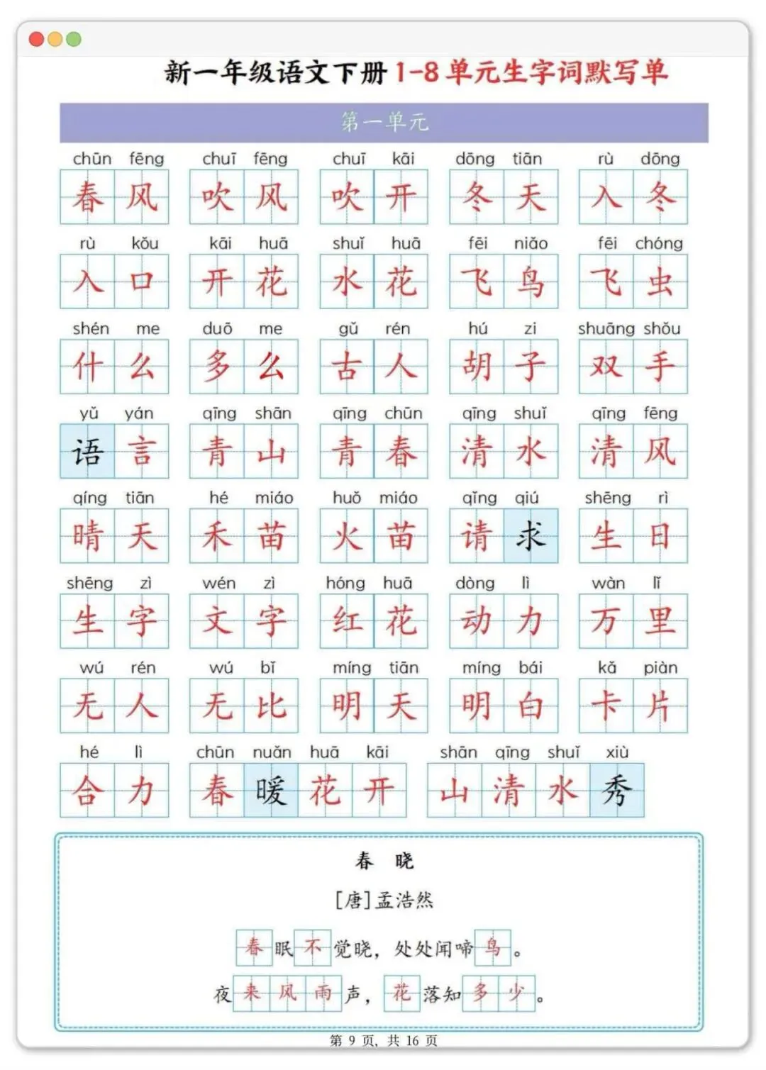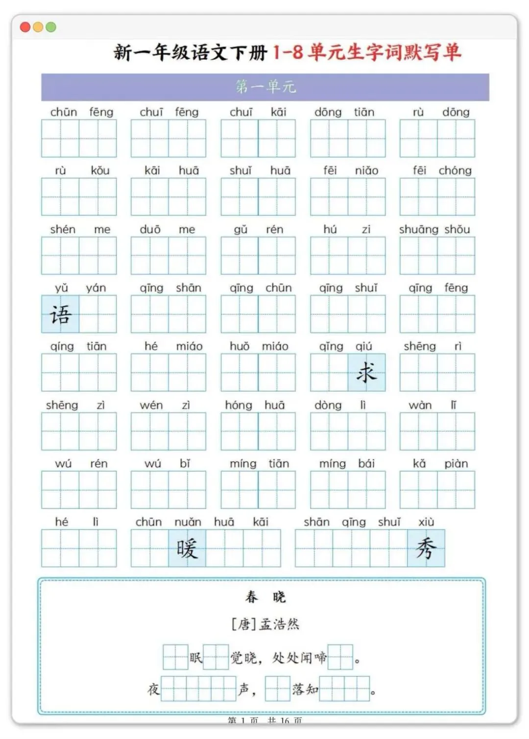 一年级下册语文1-8单元生字默写单,可打印