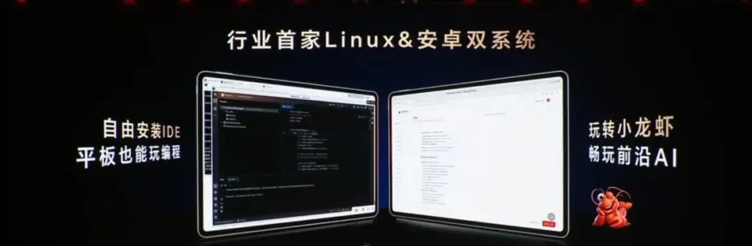 荣耀全家桶也带来了全场景产品的重磅特性升级。首先平板行业首创的Linux&安卓双系统,能玩转现在最火的小龙虾。在本地就可以部署你的专业助手。