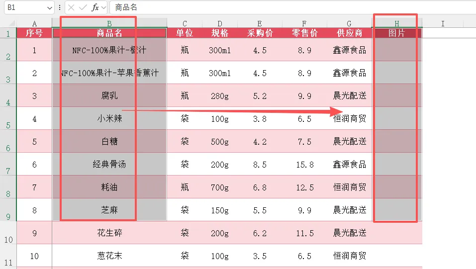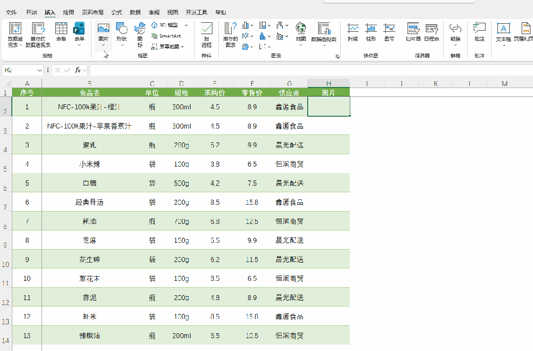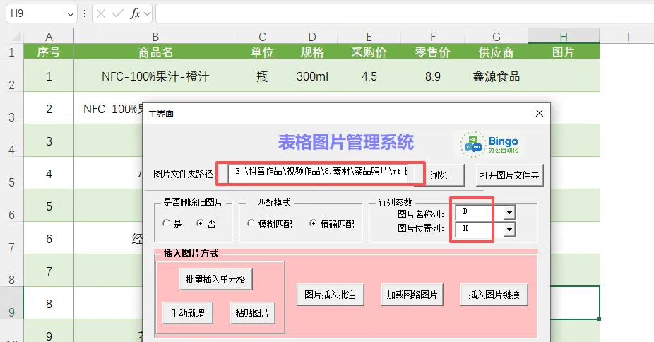 这里有200多张商品图片,现在需要把这些图片按商品名称,对应插入到这个商品列表中。