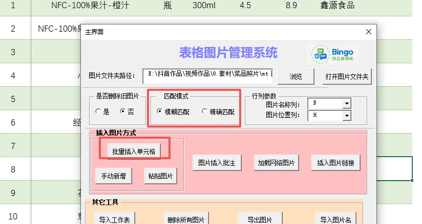 如果图片名和表中商品名一样,就先精确匹配,如果不一样,就选模糊匹配。点一下这个插入单元格按钮。