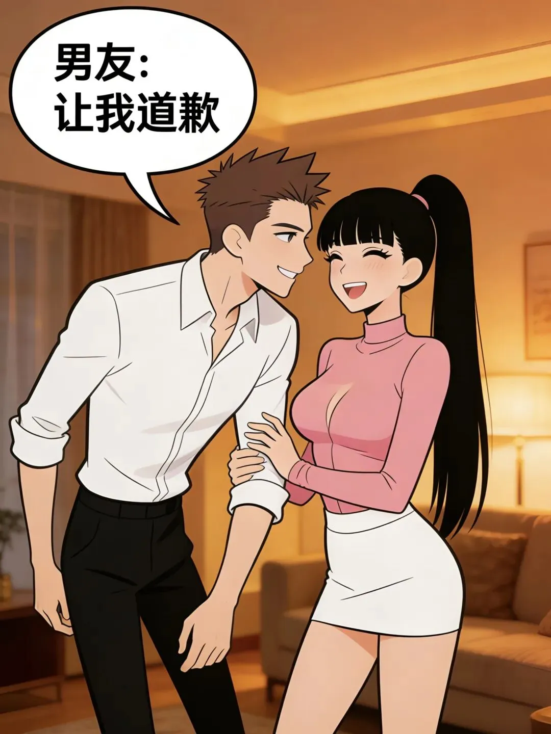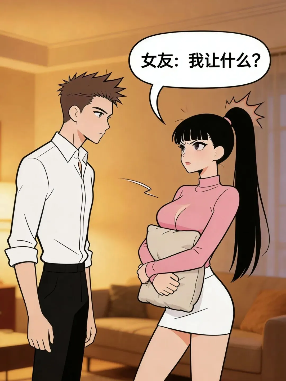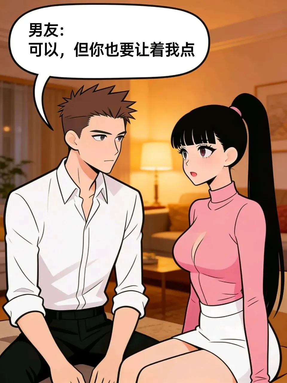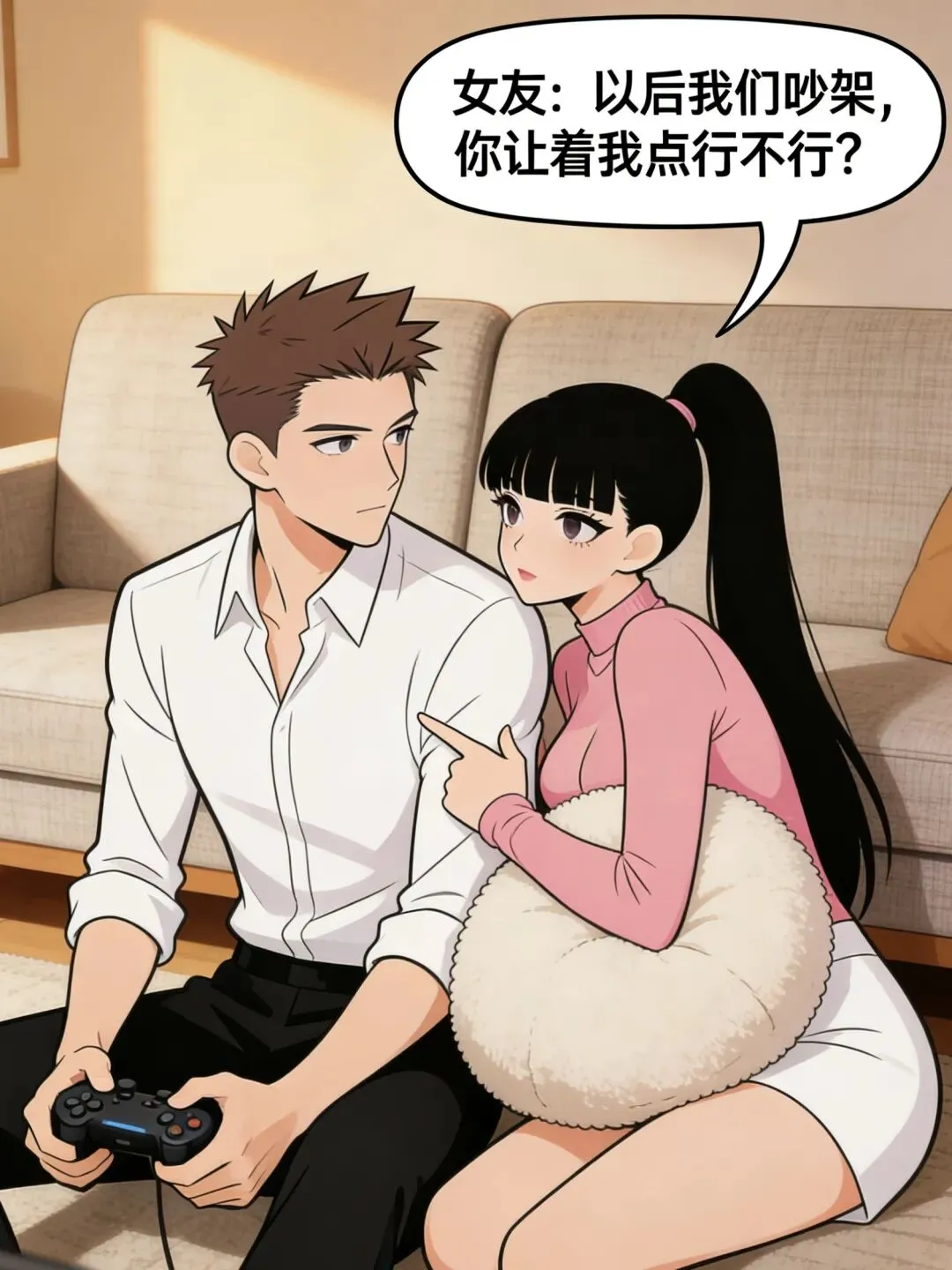 搞笑漫画:女友:“以后我们吵架,你让着我点行不行?”男友:“可以,但你也要让着我点.”女友:“我让什么?”男友:“让我道歉.”