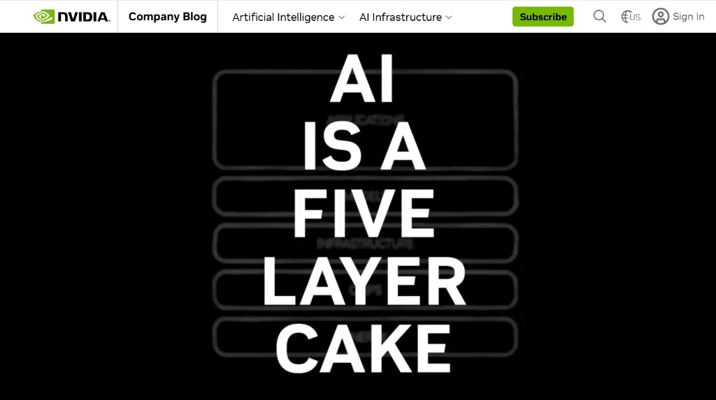 为了厘清这一庞大体系的构建逻辑,黄仁勋在文中提出了一个形象的比喻:AI是一个“五层蛋糕”(Five-Layer Cake)。这五层缺一不可,共同构成了新的数字基建。