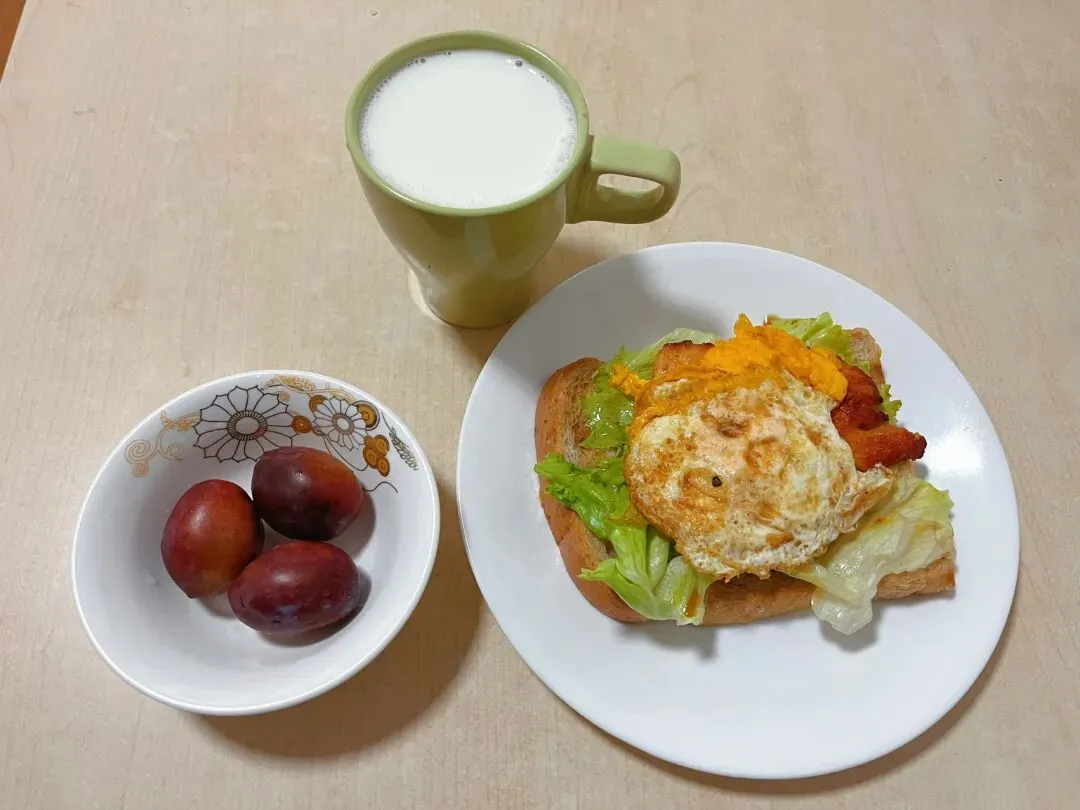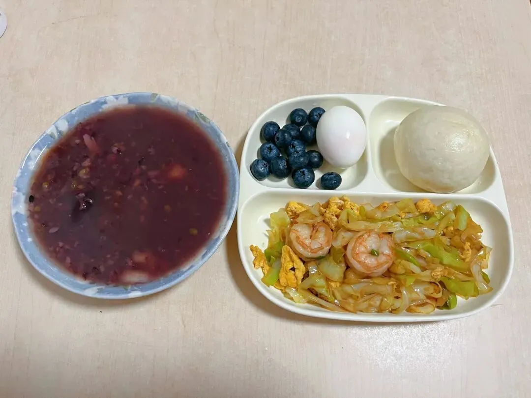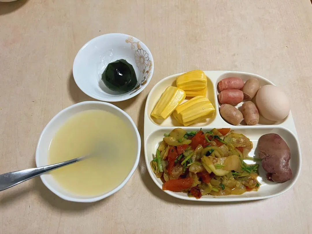 周一:二米粥,茄汁西葫芦,鸡肝,水煮蛋,小香肠,青团,菠萝蜜