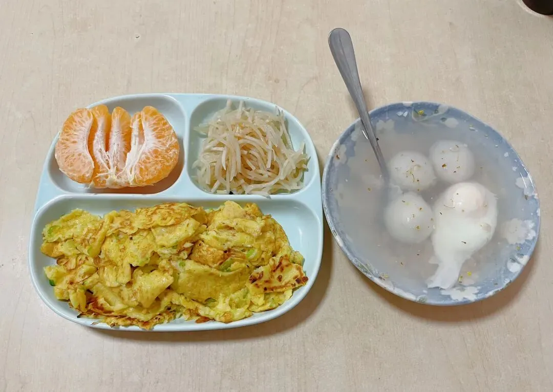 周五:米酒汤圆荷包蛋,西葫芦鸡蛋饼,芥菜丝,耙耙柑