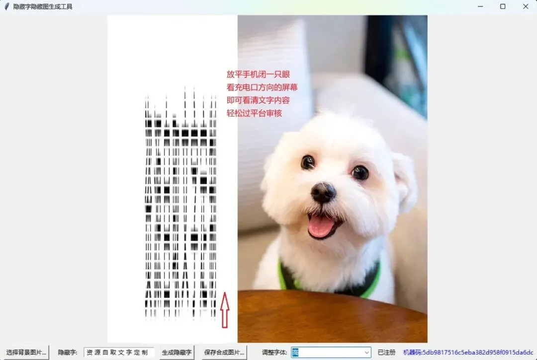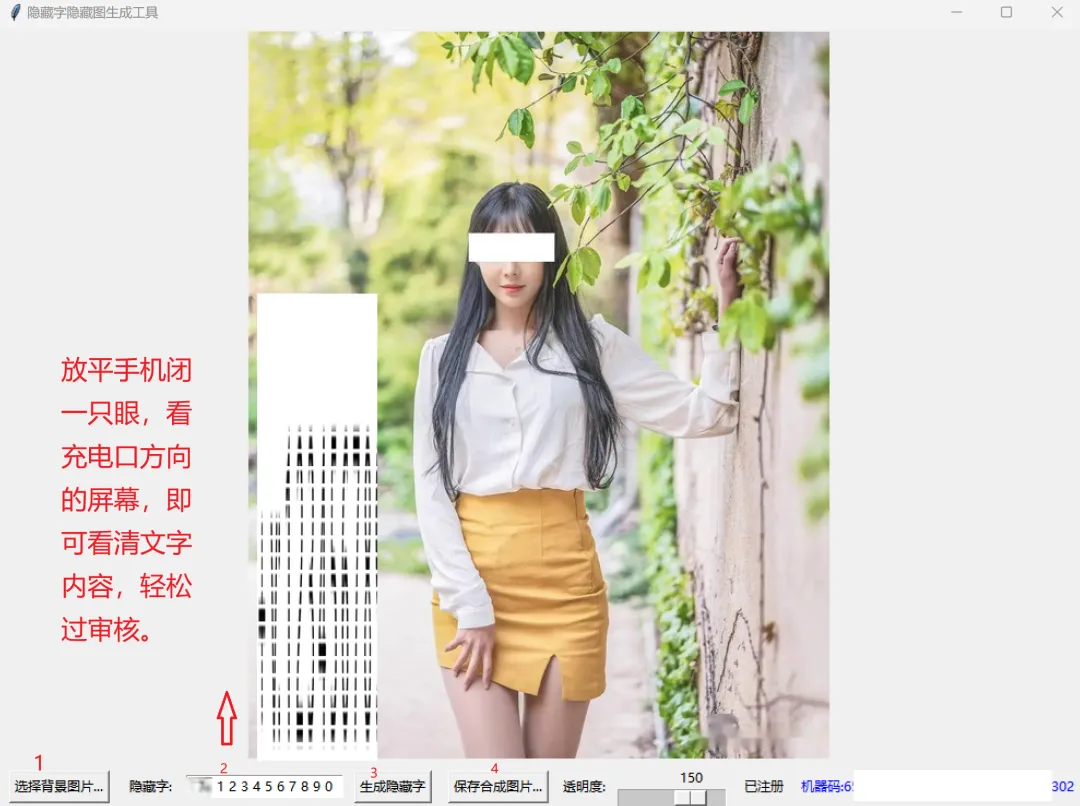 利用独特的视觉错位原理,生成的图片正常视角看只是普通背景(或杂乱纹理),机器审核很难抓取到敏感词。