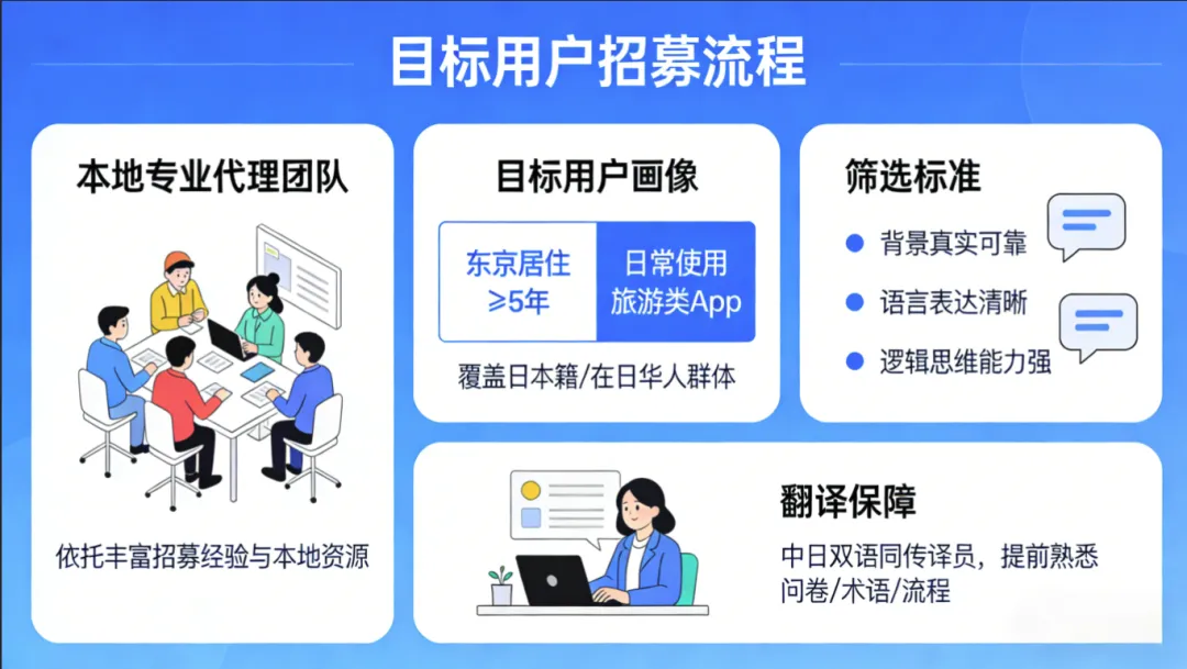 招募方面,依托本地专业代理团队,通过其丰富的招募经验和本地资源,招募在东京居住五年以上、日常使用旅游类App的目标用户,覆盖日本籍与在日华人群体,确保受访者背景真实可靠。