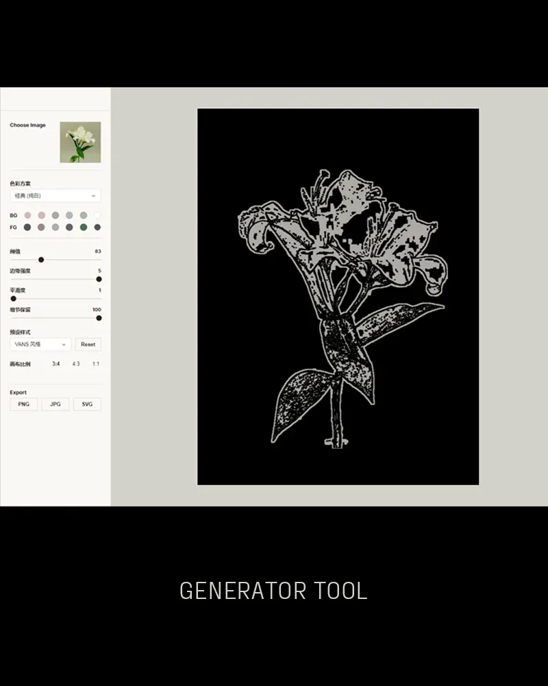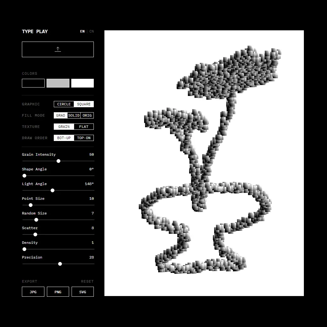 最终效果可导出为 PNG、JPG 或 SVG 格式,既适合用于海报、视觉实验,也可作为插画与概念设计的灵感工具。整体体验轻量直观,非常适合设计师进行快速风格化实验与图形创作。