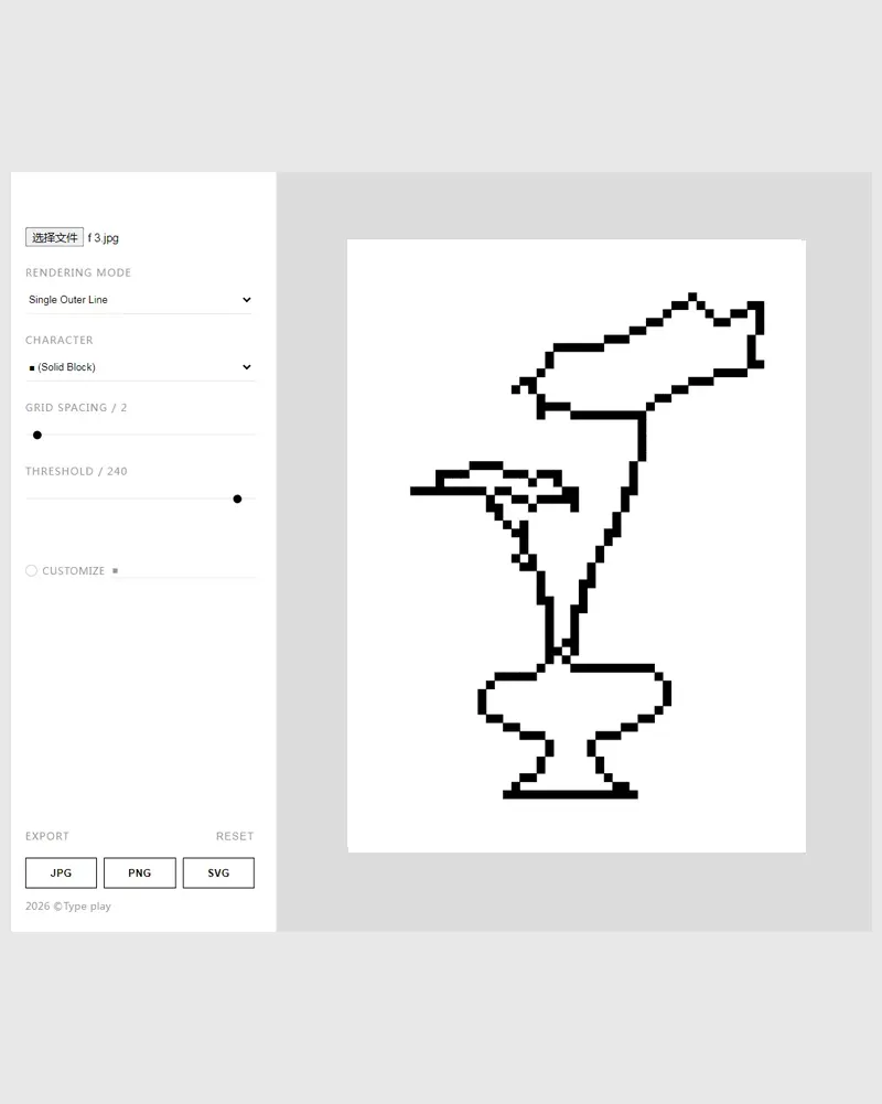 这是一款由Type play创建的图形风格效果生成工具,基于浏览器运行,无需安装即可使用。用户可以上传图片,将原始图像转化为具有设计感的图形效果。工具通过对图像明暗、轮廓与色块进行分析与重组,使画面呈现出独特的风格。