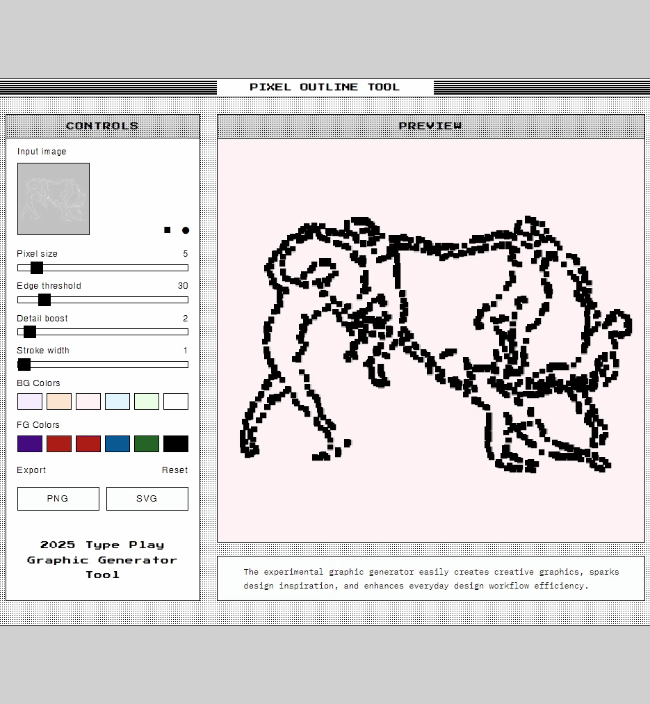 实验性图形生成器,这款工具能够将任意图片,包括非常小的图片,转换成像素和点状风格的矢量图形。生成的图像不仅保留了原图的轮廓与细节,还附带极具实验性的像素化风格,使每一幅作品都充满独特的视觉魅力。不论是用于平面设计、网页插图,还是产品包装、宣传海报,都能够轻松应对各种场景需求。同时,工具支持将最终作品导出为SVG矢量格式,保证图形在任意尺寸下都能保持高清和清晰,无论放大还是缩小都不会失真。