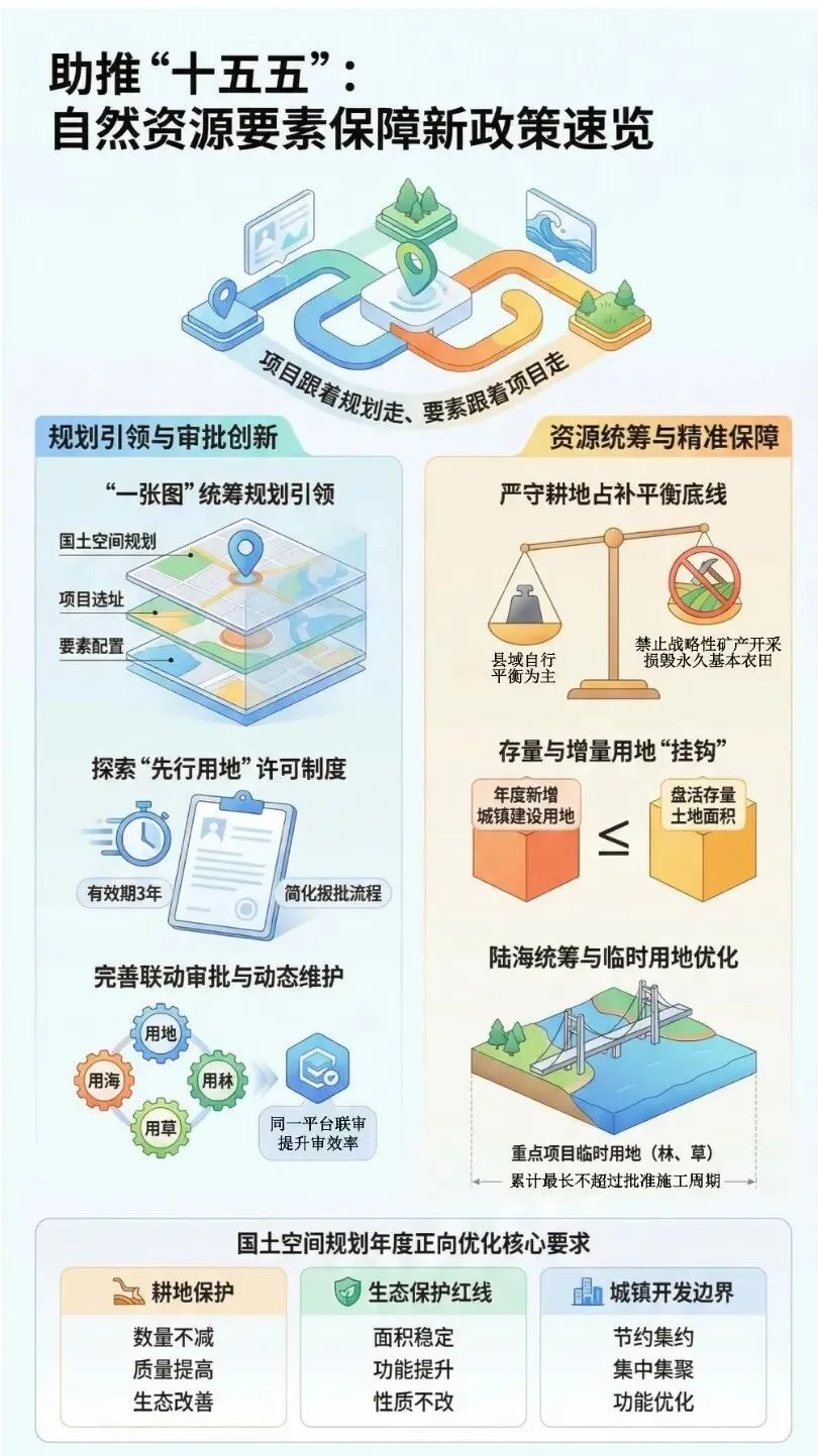 2026年3月5日,自然资源部和国家林草局共同发布《关于进一步做好自然资源要素保障的通知》(自然资发〔2026〕38号),按“项目跟着规划走、要素跟着项目走”的要求,提升自然资源要素配置效率,保障重点项目及时实施。本文通过图解方式,拆解《通知》背后的要素保障逻辑和审批提速路径,供学习交流之用。