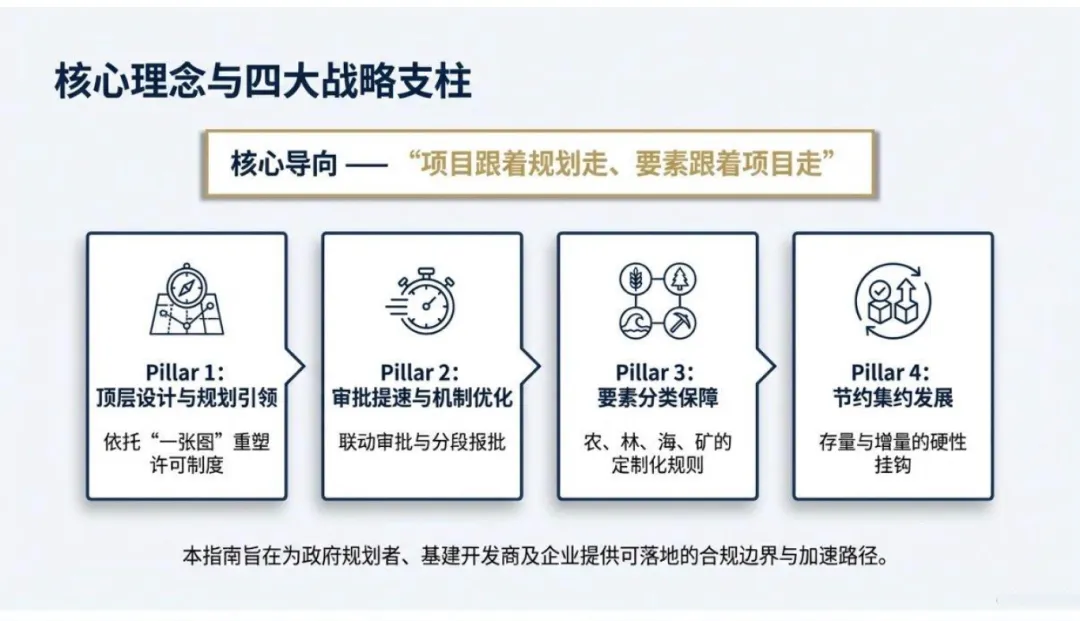 围绕“项目跟着规划走、要素跟着项目走”的核心导向,构建了四大战略支柱:顶层设计与规划引领、审批提速与机制优化、要素分类保障、节约集约发展。