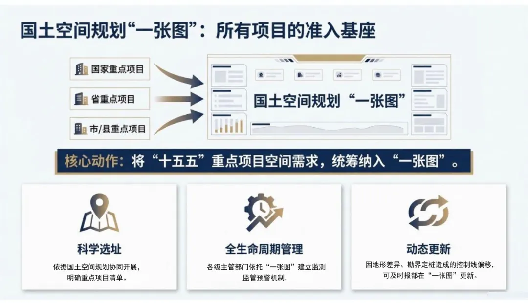 将国土空间规划“一张图”确立为所有项目的准入基座,要求各级主管部门将国家、省、市/县三级“十五五”重点项目的空间需求,全部统筹纳入“一张图”管理,从源头实现空间资源的统一配置。