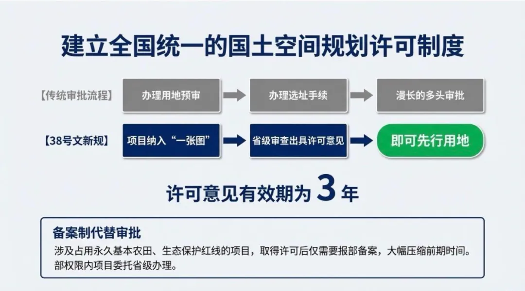 对传统审批流程进行了颠覆性重构,大幅压缩项目前期工作周期:对于纳入“一张图”的项目,只需经省级审查出具许可意见,即可先行用地,替代了原先“办理用地预审→办理选址手续→多头审批”的冗长流程,许可意见有效期为3年。