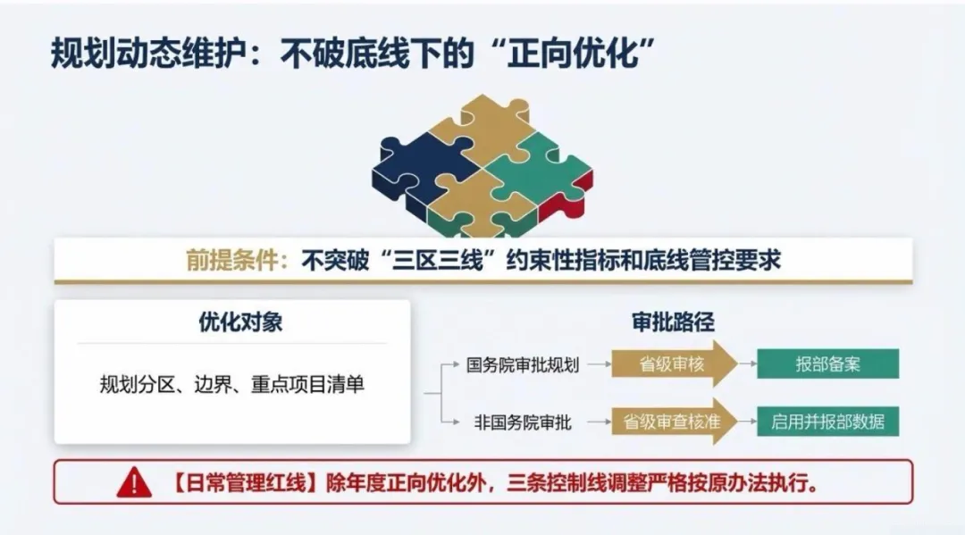 建立了“不破底线、正向优化”的规划动态调整规则,允许在不突破“三区三线”约束性指标和底线管控要求的前提下,对规划分区、边界、重点项目清单进行年度优化。