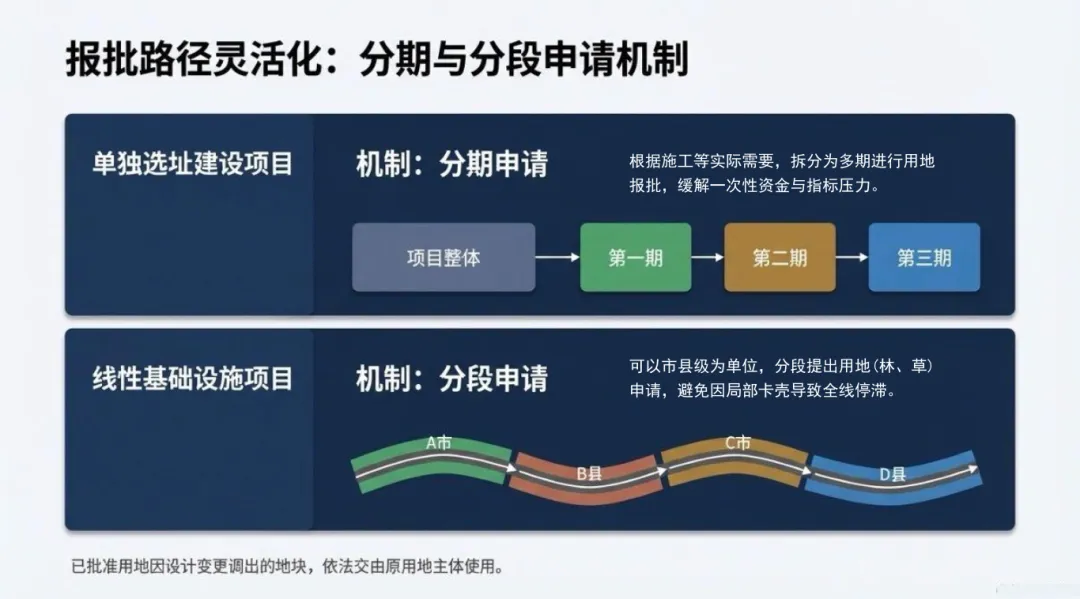 2. 线性基础设施项目:可以市县级为单位,分段提出用地(林、草)申请,避免因局部卡壳导致全线停滞。