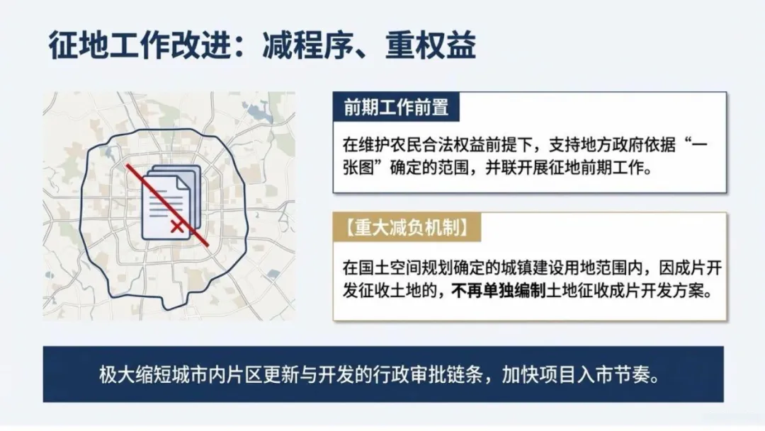 在征地工作中兼顾效率提升与权益保障:在维护农民合法权益的前提下,支持地方政府依据“一张图”确定的范围,并联开展征地前期工作;尤其是在城镇建设用地范围内因成片开发征收土地的,不再单独编制土地征收成片开发方案,极大缩短城市片区更新与开发的行政审批链条,加快项目入市节奏。