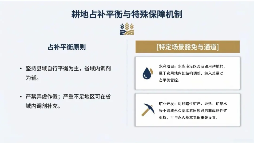 耕地占补平衡方面坚持“县域自行平衡为主,省域内调剂为辅”的原则,同时设置两类特殊场景豁免通道: