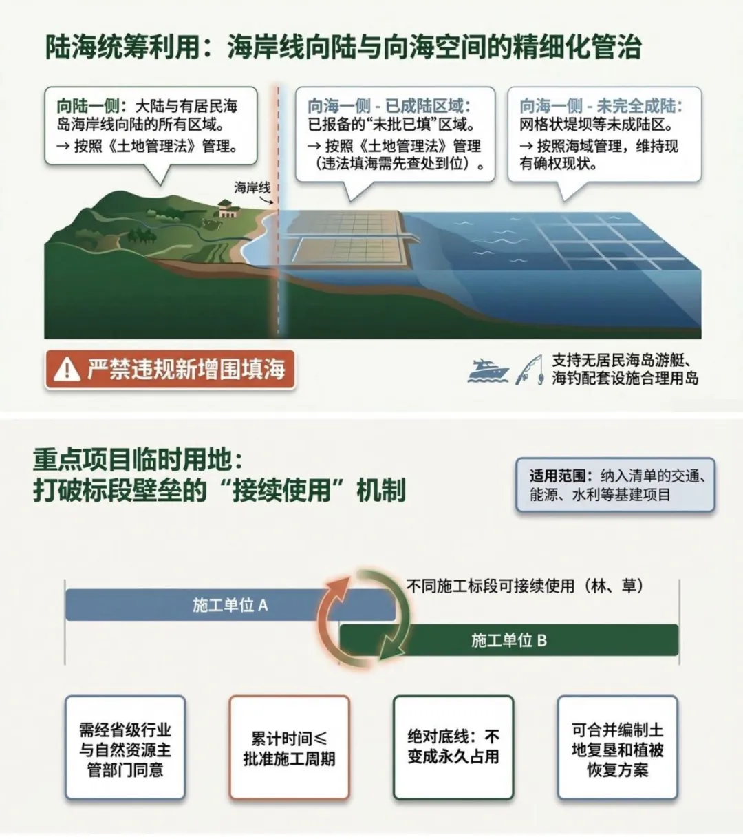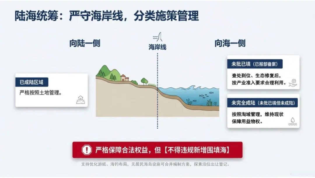 3.向海一侧未完全成陆区域:按照海域管理,维持现状,保障合法用益物权。