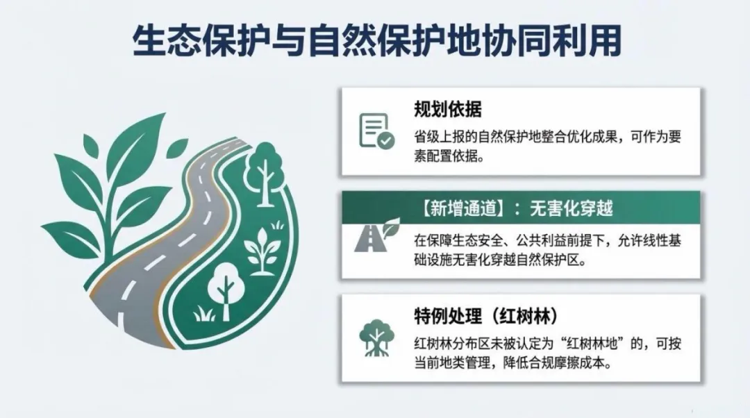 生态保护方面,省级上报的自然保护地整合优化成果可作为要素配置依据,核心突破点在于允许线性基础设施在保障生态安全、公共利益的前提下,无害化穿越自然保护区;针对红树林特殊情况,分布区未被认定为“红树林地”的,可按当前地类管理,降低合规摩擦成本。