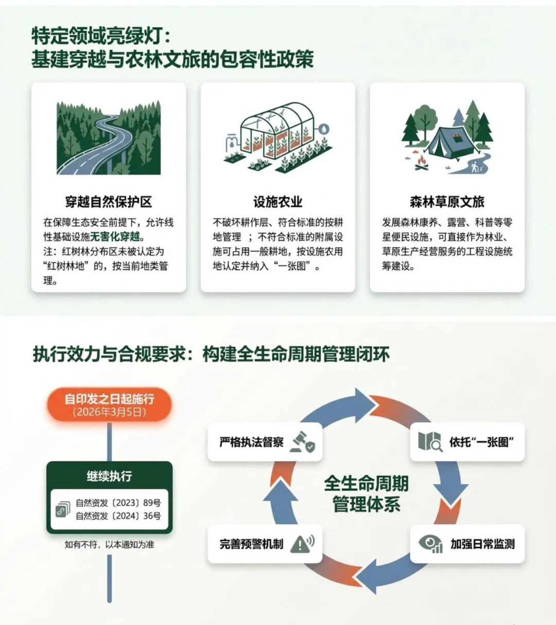 1.设施农业:不破坏耕作层、符合认定标准的农业生产设施按耕地管理;不符合标准且必要的附属、配套设施可占用一般耕地,按农业设施建设用地认定并纳入“一张图”管理;