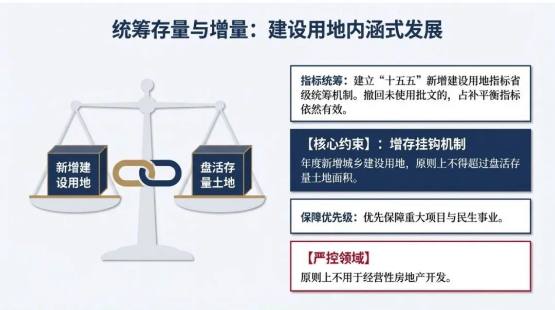 核心约束机制为“增存挂钩”:年度新增城乡建设用地规模,原则上不得超过当年盘活存量土地的面积,倒逼地方提升土地利用效率。指标保障优先级向重大项目与民生事业倾斜,原则上不用于经营性房地产开发。
