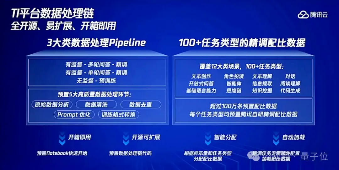 具体来说,腾讯云TI平台提供了三大类数据处理pipeline,包括100多种任务类型的精调配比数据,支持知识问答、有监督的多轮和单轮问答以及无监督的预训练等。