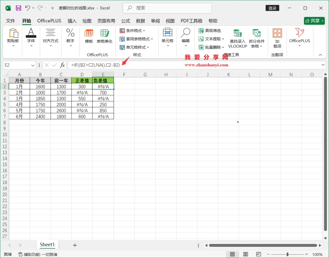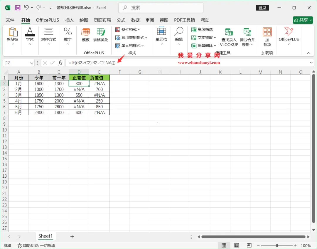 2、第一步,调整数据源,增加正差值和负差值辅助列,其中正差值等于「今年」大于「前一年」时两年的差值;负差值相反;