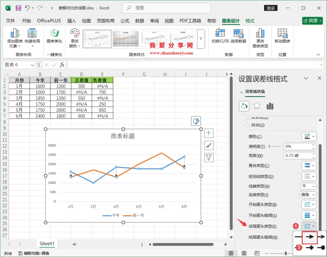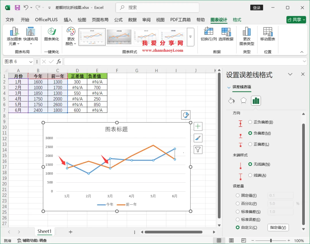 5、第二步,添加差额线段,先单击选中今年系列折线,然后点击图表右上角【+】按钮,勾选【误差线】,继续点击右侧【▶】按钮→【更多选项】;