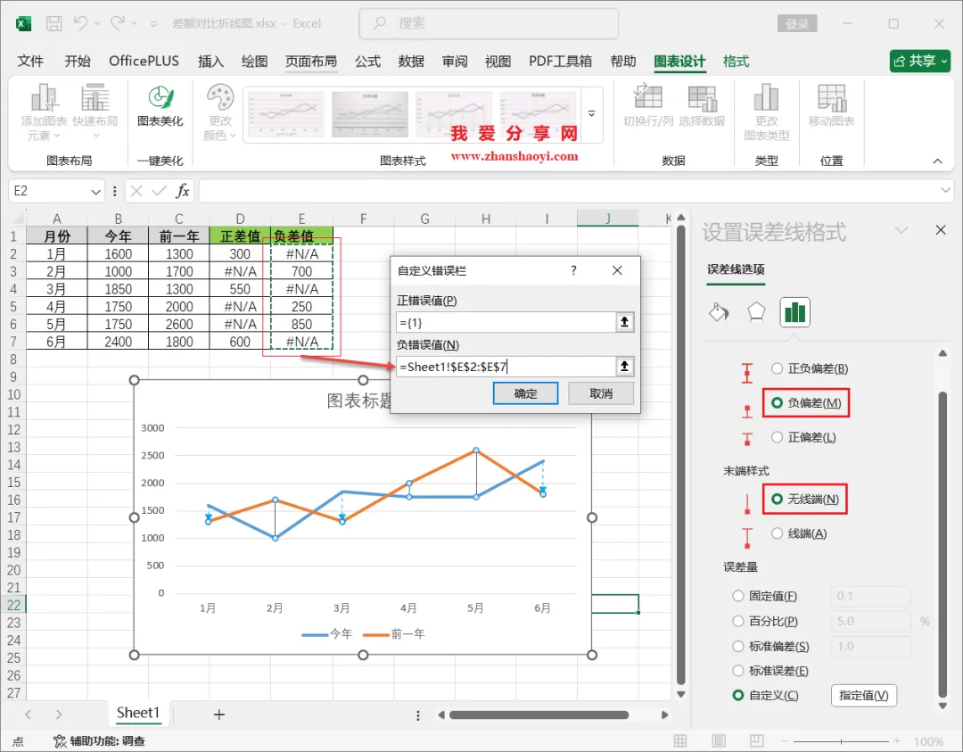 7、弹出自定义错误栏窗口,负误差值下面的框中指定D2:D7单元格,然后点击【确定】,插入正差值的差额线段效果如下: