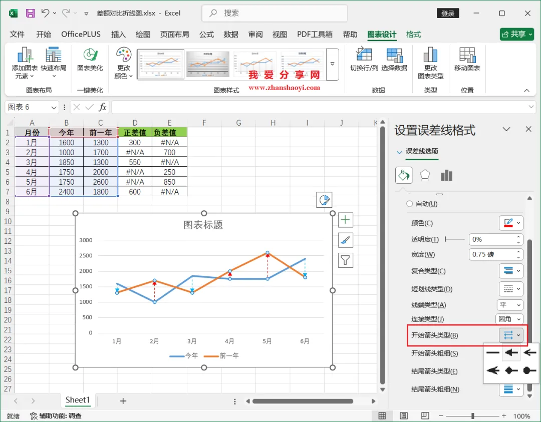 9、类似,添加负差值的差额线段,但需要注意:这里是开始箭头类型选择箭头;