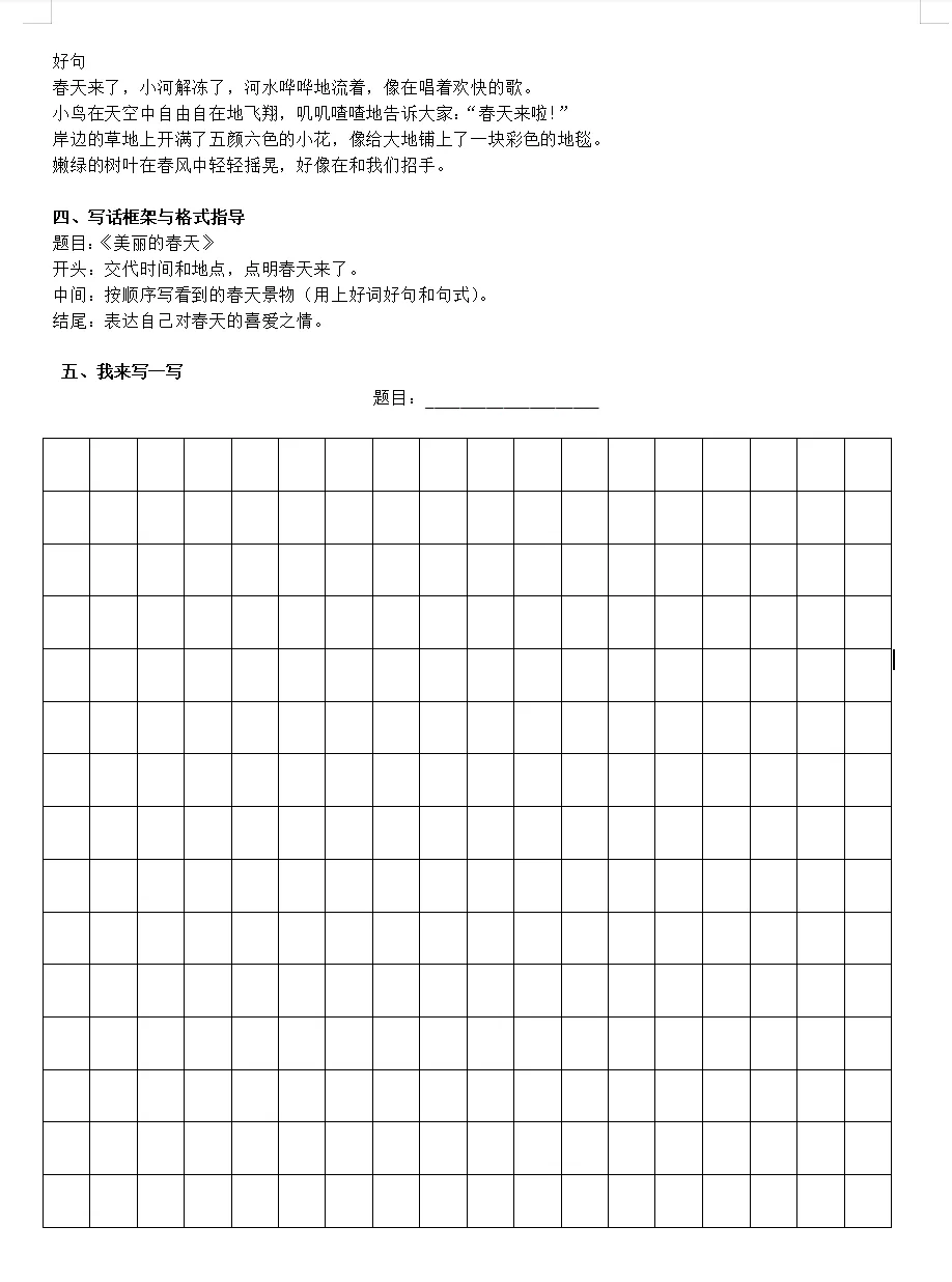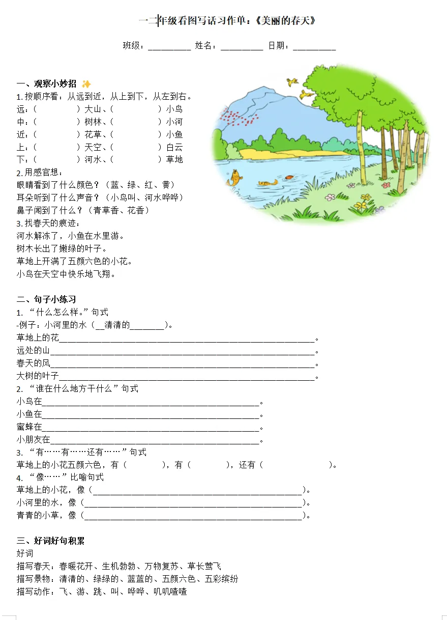 一年级看图写话神器!《美丽的春天》习作单,拯救“词穷娃”!