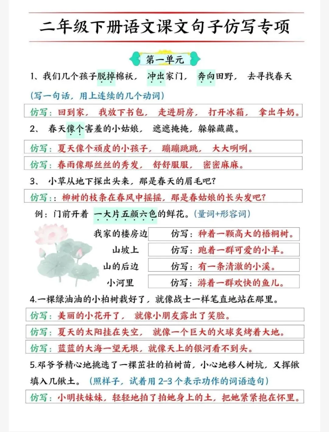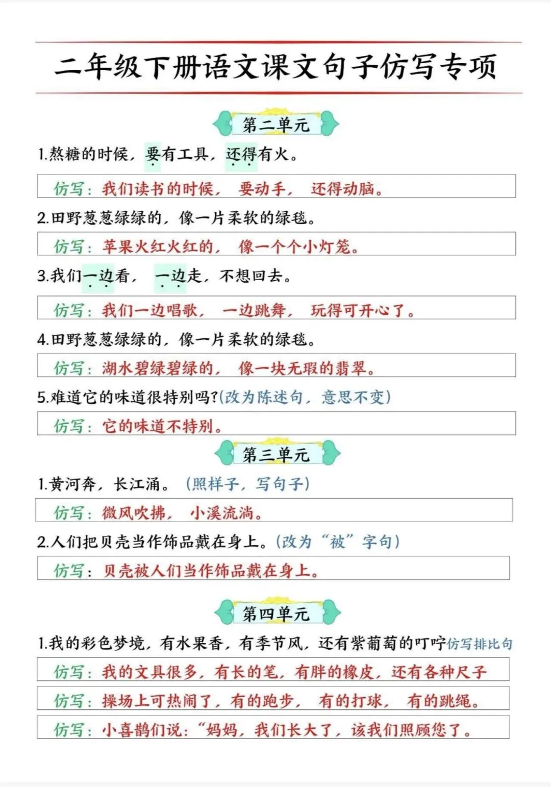 今日分享26春《二年级语文必考的仿写句子读背版》电子版可打印,按八个单元划分仿写专项,涵盖连续动词、比喻、拟人、排比、句式转换(反问改陈述、把被字句互换)、扩写、关联词造句等多种题型,每个题型均附例句和仿写示例,部分位置还留有空白仿写练习处,同时包含少量课内拓展类仿写题目,贴合课本知识点,是针对性的句式练习资料。