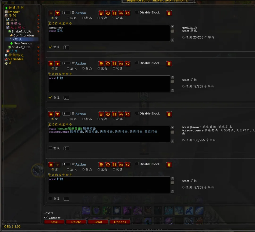 大概说一下这个原理。AOE宏里面我全部写了/castsequence 旋风斩,暴怒/嗜血/怒击/斩杀,而且调整的基本大差不差。基本概念就好比你在1234上分别放了四个宏,分别是